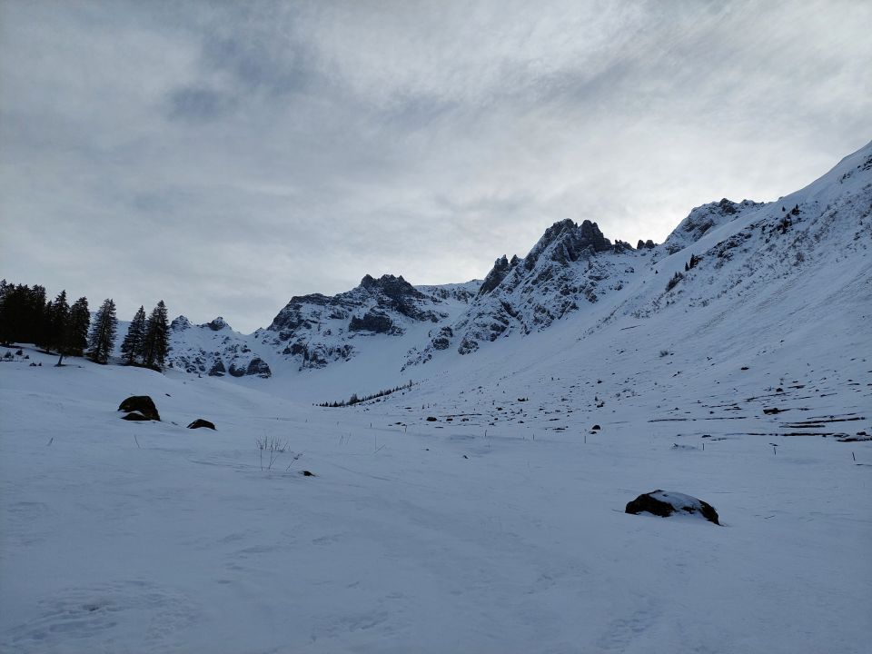 Aufstieg: Start -1°C. Ab der Brücke hat es genug Schnee für den Aufstieg. Wir sind zuerst rechts vom Lawinenkegel aufgestiegen, dann haben wir weiter oben auf die linke Seite gewechselt.