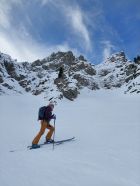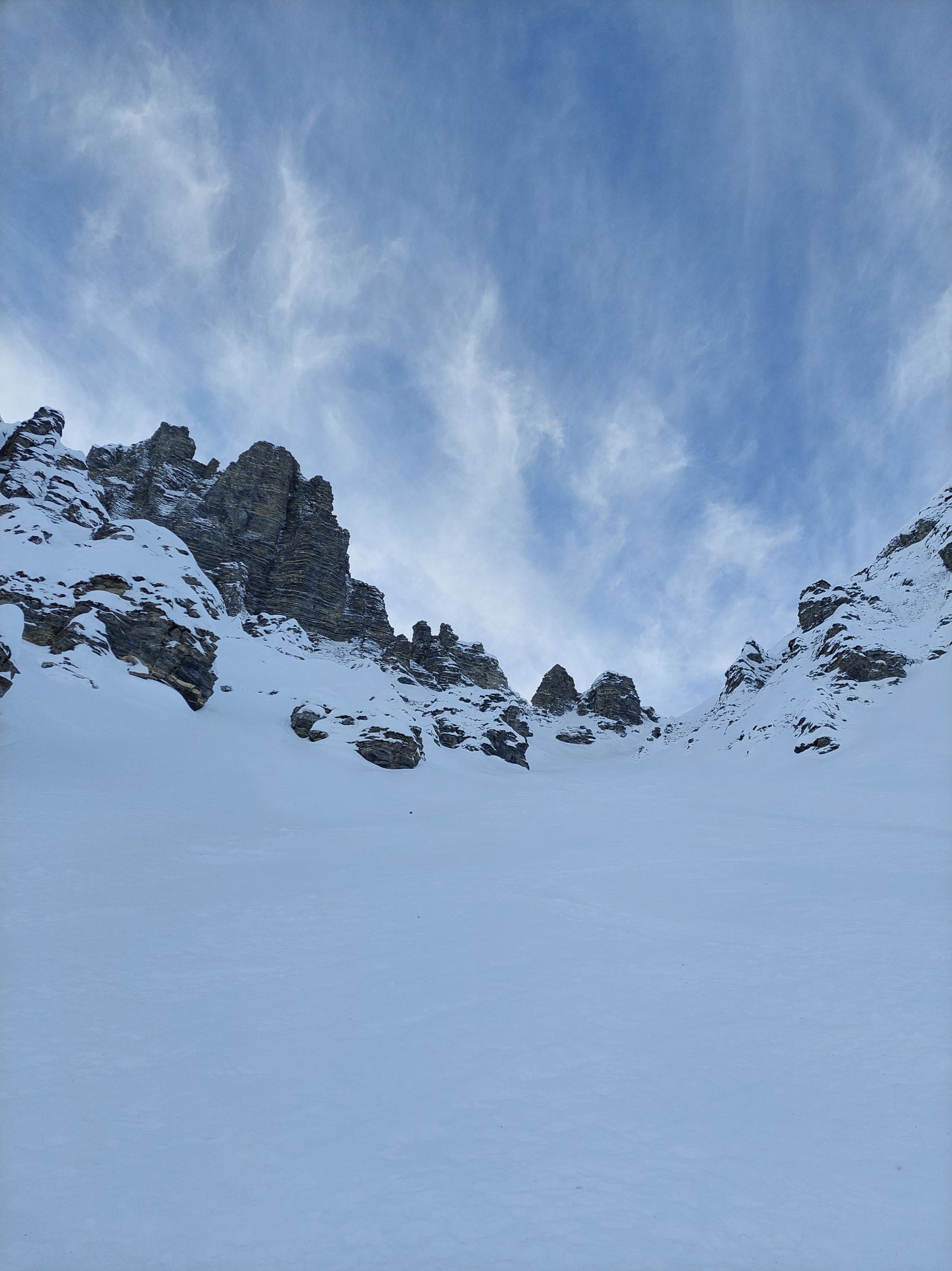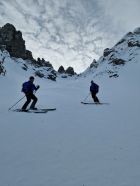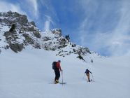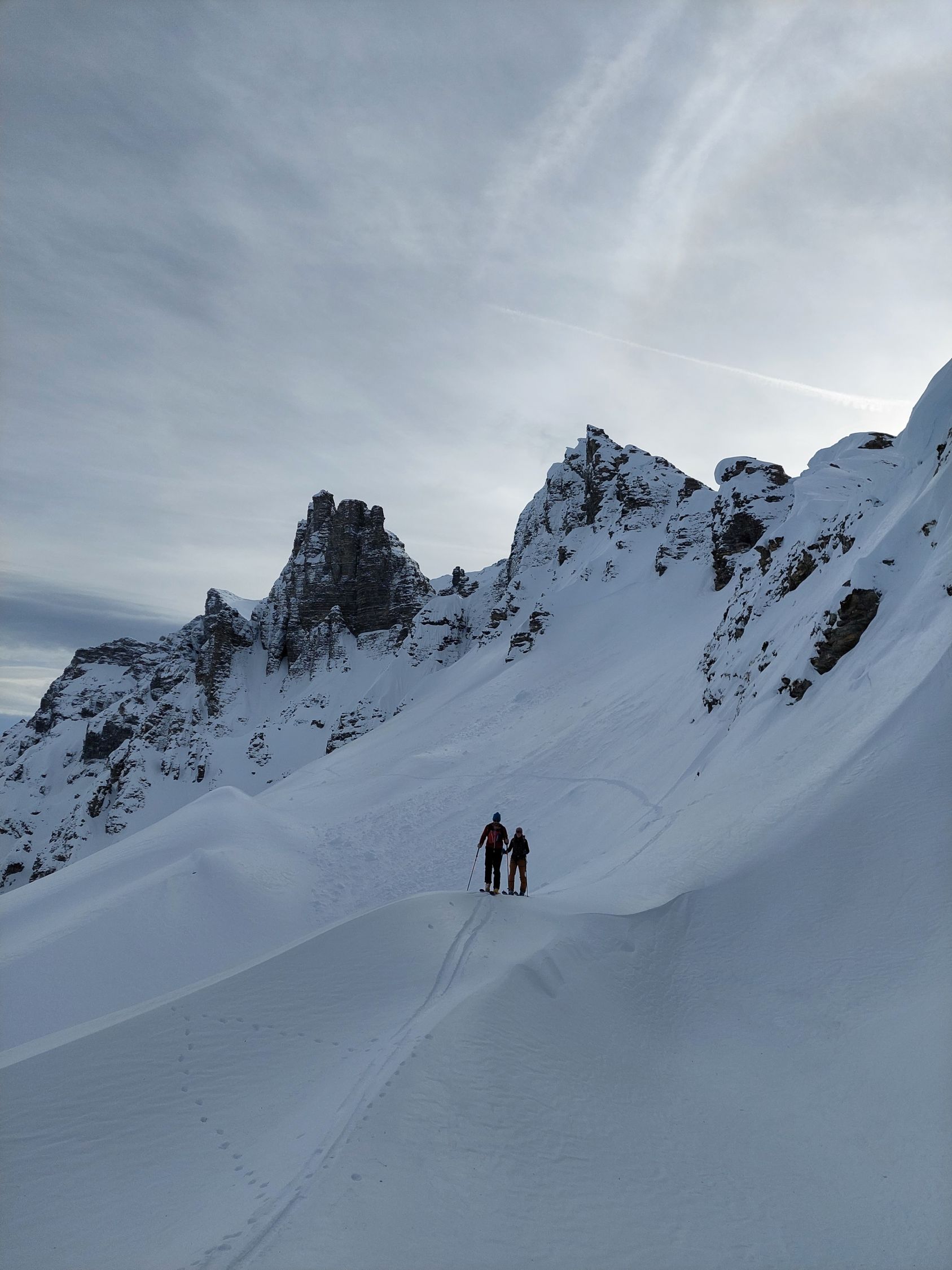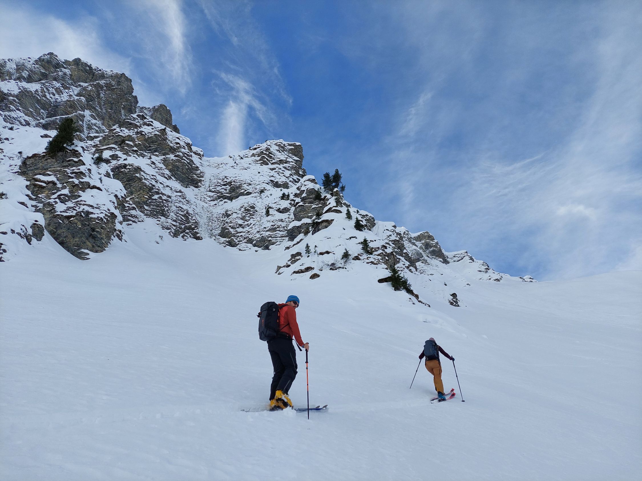 Den Graben, wo die Lawine abgegangen war, haben wir ganz oben gequert. Der Aufstieg ist unten im Steibode hart, weiter oben hat es Bruchharst. Der Steilhang links der Lawine hat abwechselnd viel Presspulver, dann wieder harte Stellen.