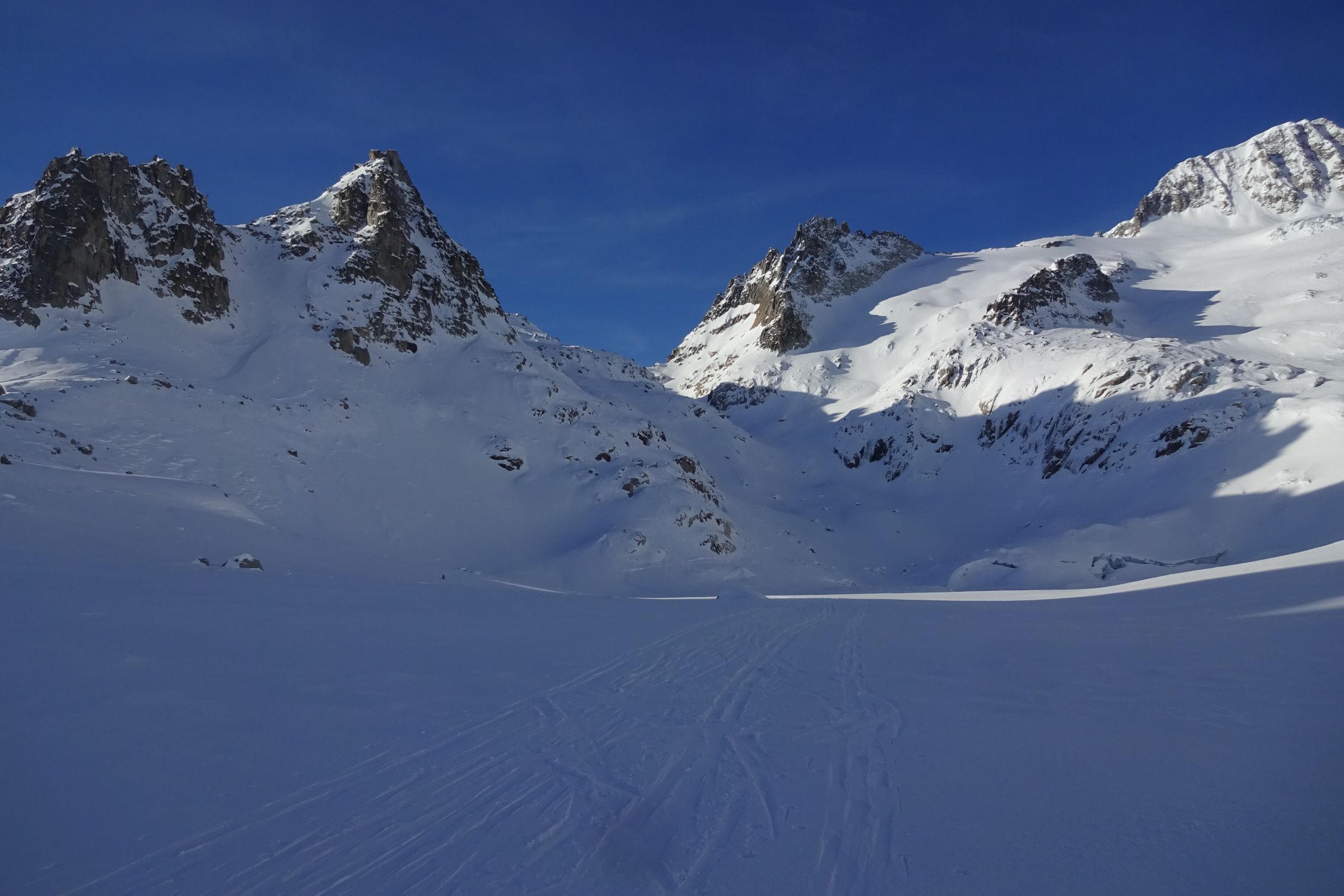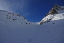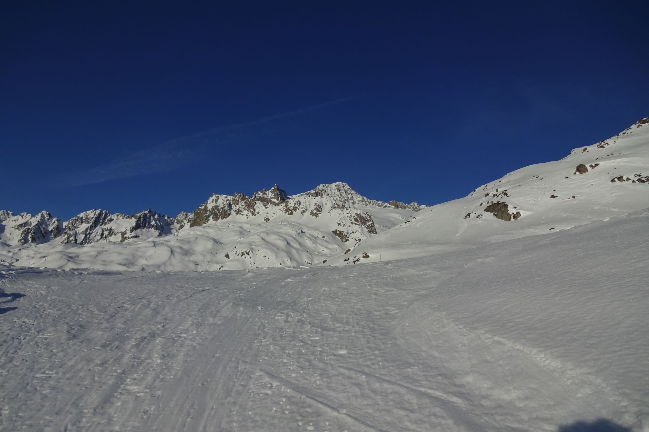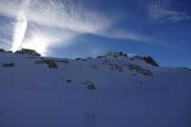 In der Abfahrt haben wir den Schafberg mitgenommen. Bis Tiefengletscher pistenähnliche Verhältnisse mit Pulver, die Spass machten. Vom Schafberg um 13.30 Uhr immer noch mehrheitlich gefrorener Hartschnee und dementsprechend teilweise ruppig. Im unteren Teil waren einzelne sonnenexponierte Hänge leicht angesulzt.