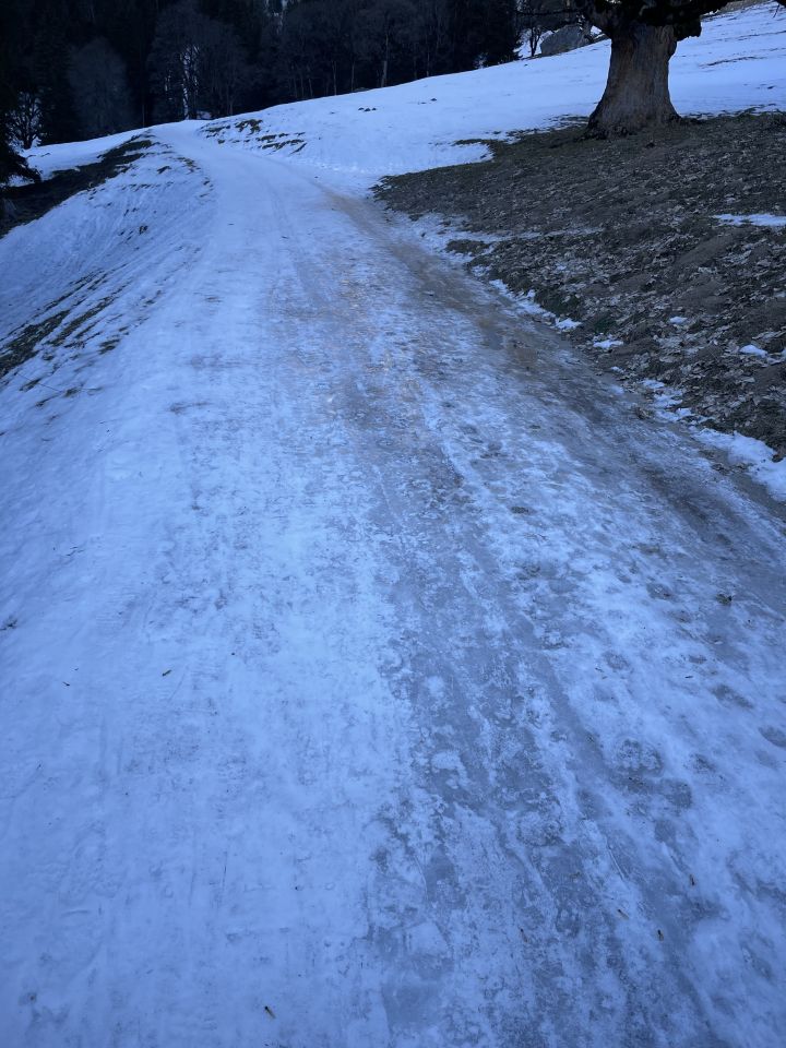 OK das mit den Smileys ist natürlich Ansichtssache, aber gemessen an meinen Erwartungen und auch objektiv ist dunkelgrün vertretbar. Primäres Ziel heute war draussen sein und Kalorienvernichtung nach der üblichen (und schönen) Weihnachtsvöllerei. Auf eine schöne Abfahrt wagte ich nicht zu hoffen. Los am spiegelglatt vereisten PP Meniggrund mit Ziel unbestimmt, man kann ja später noch entscheiden. Dann Richtung Stand oder Fromattgrat, man würde sehen. Unterwegs festgestellt, dass die sonnenexponierten Hänge eventuell ok sein könnten, Fromattgrat ist voll im Schatten und fiel weg. Aufm Stand dann Entscheid, Richtung Seeberg abzufahren, und Schwein gehabt: schöne Hänge prima aufgefirnt. Juhui und nochmal rauf und gleich wieder runtergefahren. Dann zum dritten Mal rauf, diesmal zum Affenfelsen und ganz rüber und die ebenfalls sonnigen Hänge dort zur Abfahrt genutzt. Auch hier tipptopp und die letzten Hänge zur Alpstrasse ohne Einbrechen auf der tragenden Kruste gefahren. Die eisige Alpstrasse dann schnell wie selten, im Hui am PP. Wer hätte das gedacht?