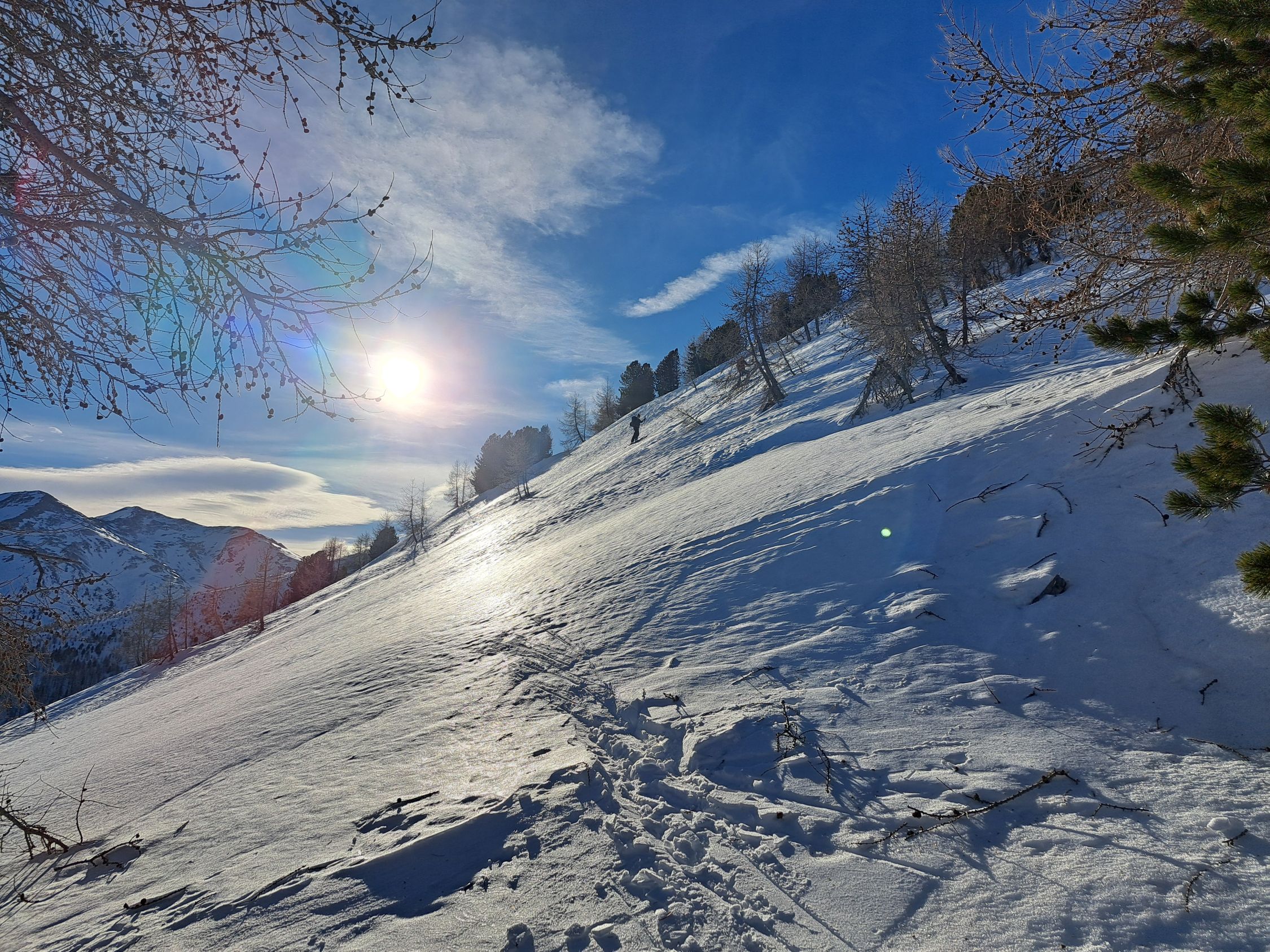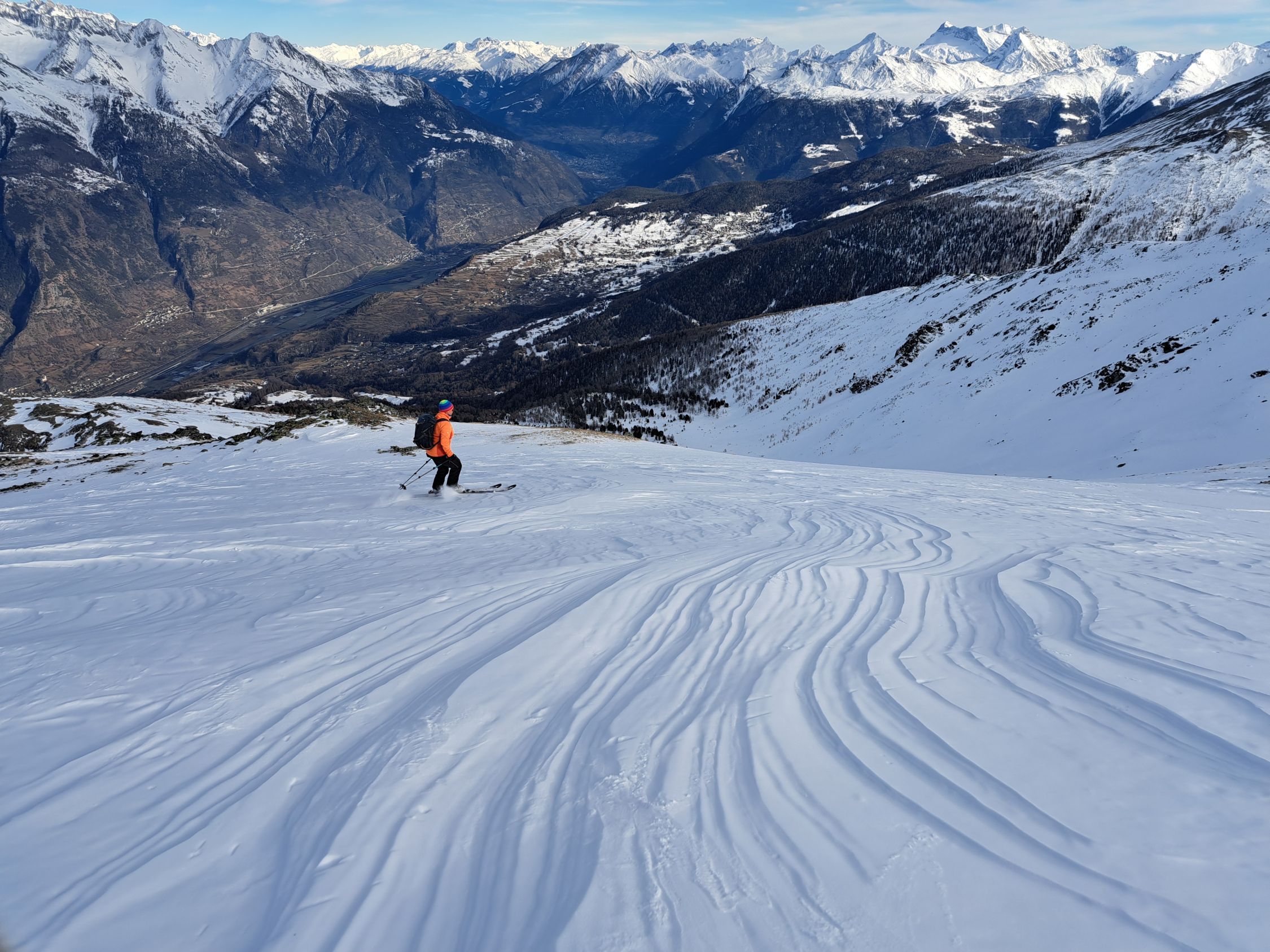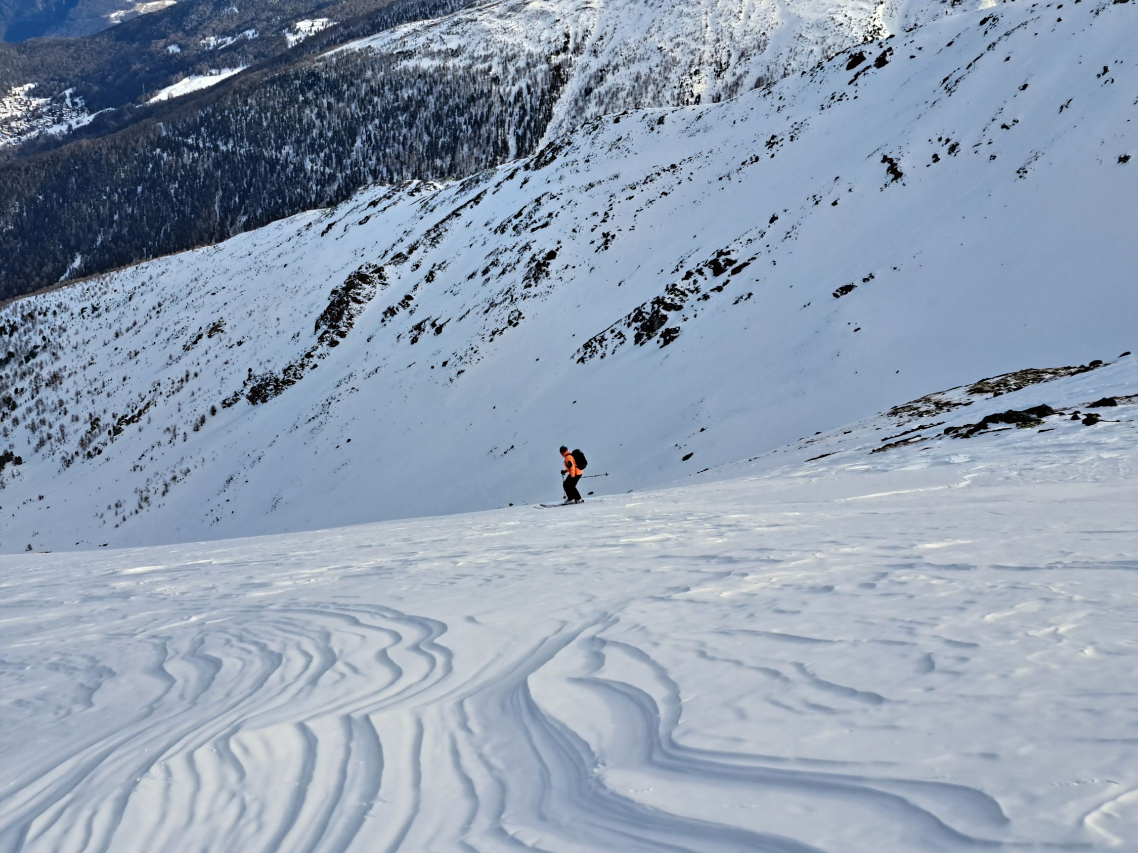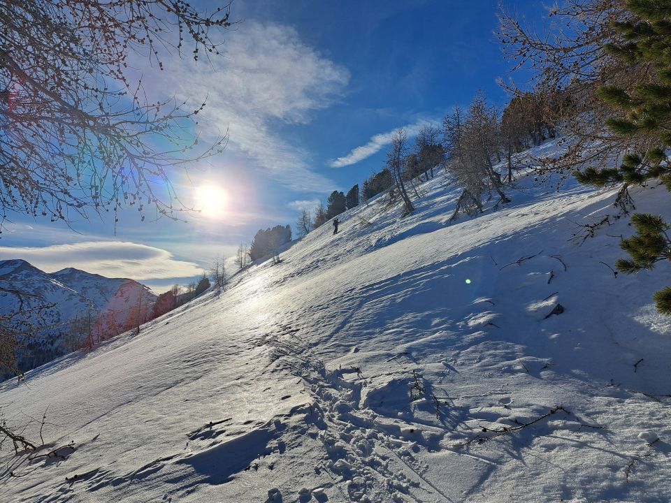 Die Harscheisen waren heute im Aufstieg ein nützlicher Teil der Ausrüstung. Die Birkhühner hatten es einfacher, sie konnten fliegen. Wunderbare Aussicht und fast windstill auf dem Gipfel. Bei der Abfahrt konnte man mit guter Routenwahl die grössten Holperstellen problemlos umfahren, dann Skipiste, dann neben der gesperrten Skipiste auf den letzten Schneeflecken bis ganz nach Eischoll hinunter.