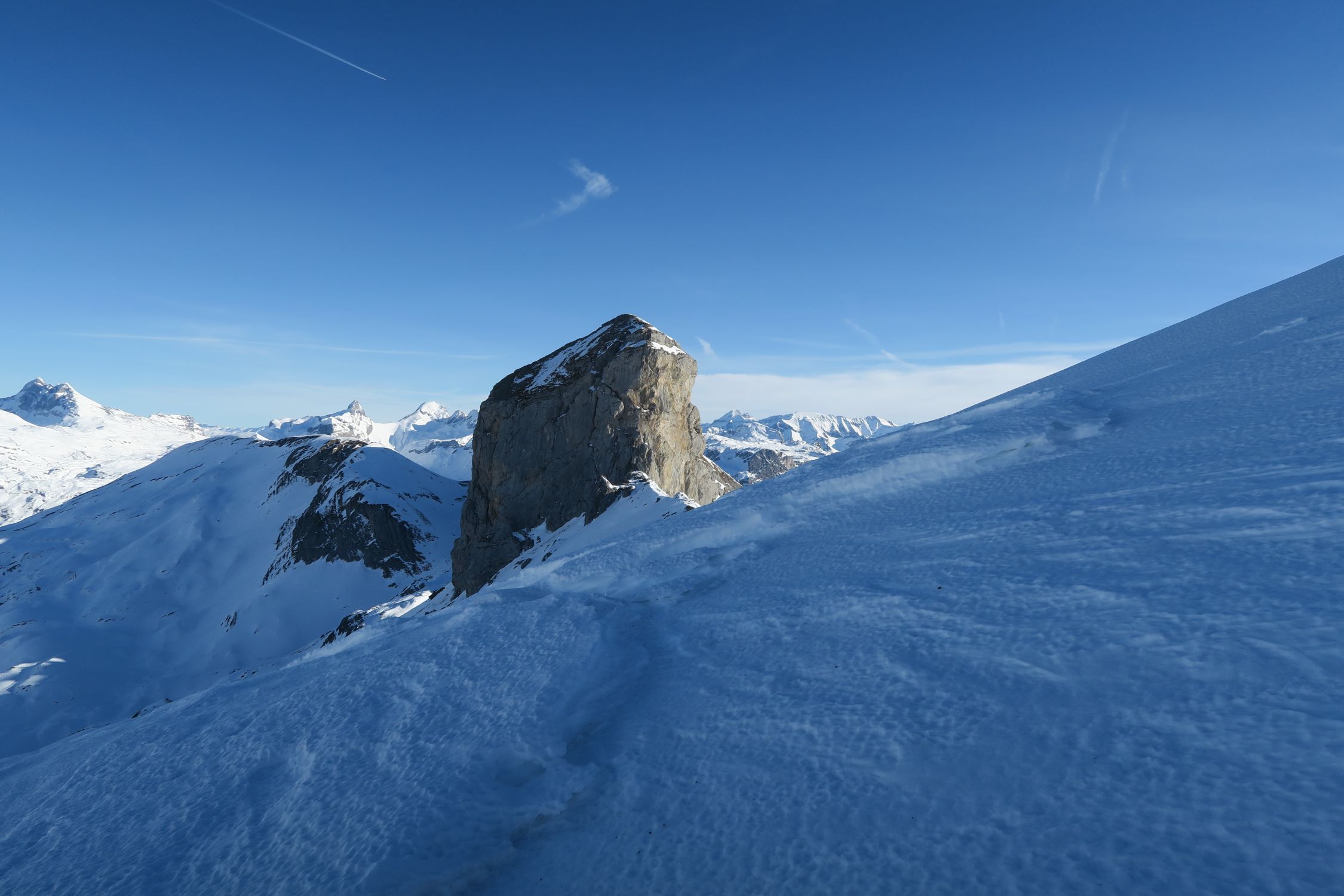 Ab Schranke 500 Meter zu Fuss, danach (mehrheitlich) durchgehende Schneedecke auf der Strasse. Nach klarer Nacht war die Schneedecke tragend, Gipfelhang hart, aber mit Harscheisen gut machbar. Abfahrt anfangs etwas ruppig, dann mit Sonneneinwirkung schön griffig.