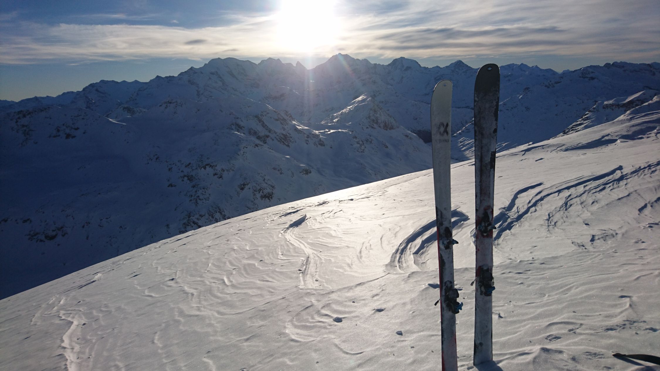 Der Sturm hat ganze Arbeit geleistet. Nun eine Mischung aus Eis, Bruchharsch, hin und wieder tragender Deckel. Firn gibts leider noch nicht. War danach noch am Piz Chatscheders. Oben etwas abenteuerlich, da steil und ausgesetzt.