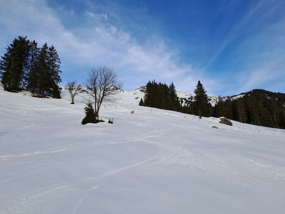 Habe die Tour erst um 11 Uh gestartet, damit die harte Schneekruste von der Sonne etwas aufgeweicht wurde. An den südexponierten Hängen war die Situation frühlingshaft und recht schön zu fahren. Daher habe ich für die Abfahrt zur Route gewechselt, die auf den Gulderturm führt. Das hat sich ausbezahlt. Die übrigen Expositionen waren trotz relativ hohen Temperaturen steinhart. Schnee hatte es gerade noch bis auf Höhe der Talstation.