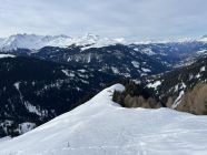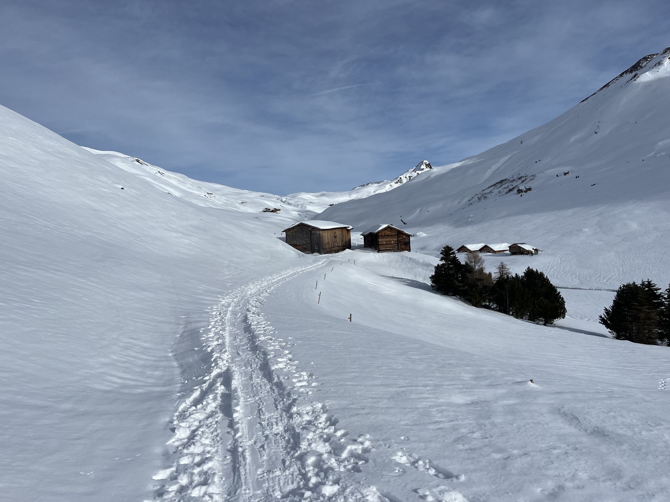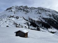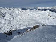 Ganze Route gut eingeschneit und mit Ski bzw Schneeschuhen begehbar. Südseitig hart und tragend, wegen dichter Schleierwolken ziemlich schleppendes Aufsulzen. Nordseitig stellenweise noch schöner Pulverschnee, aber immer wieder unterbrochen von Stellen mit hartem Schnee.