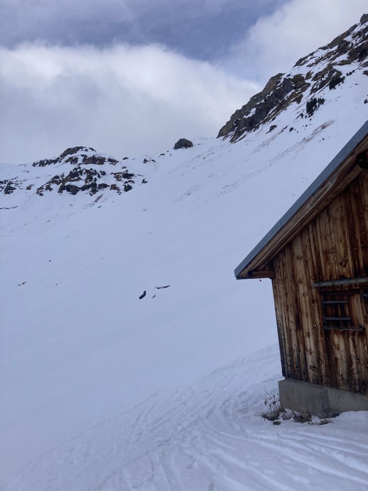 Die ersten 100m sehr wenig Schnee, Strasse ist aper bis P1253. Ab da Ski nicht mehr getragen. Alle steilen Ost und Südhänge sind leicht angesulzt. Bin über Madfirggl der Kante entlang, zum Schluss die letzten 20m zu Fuss über apere Wiese zum Gipfel. Die steilen Südhänge unter den Chöpf haben sich alle schon entleert.