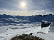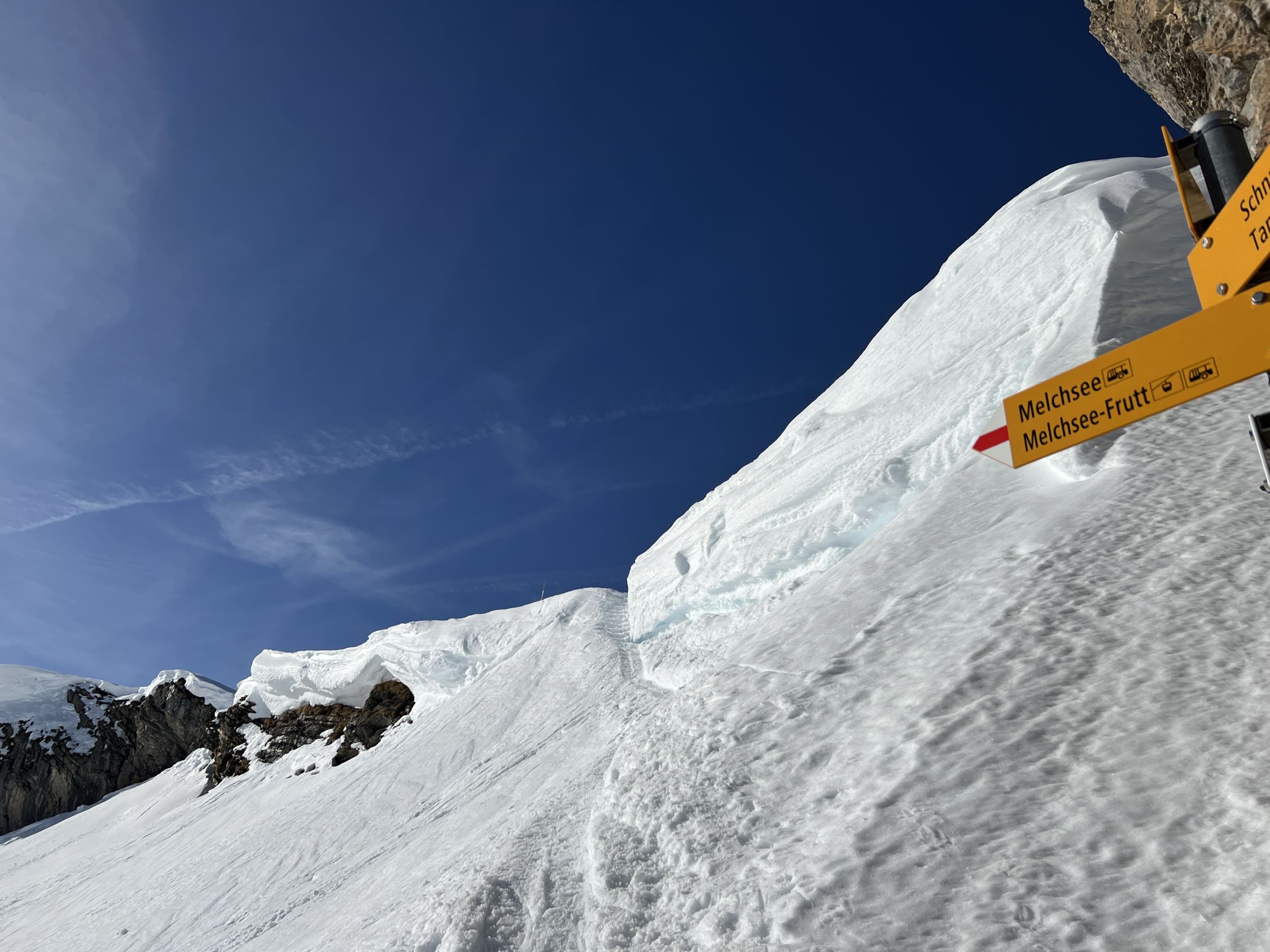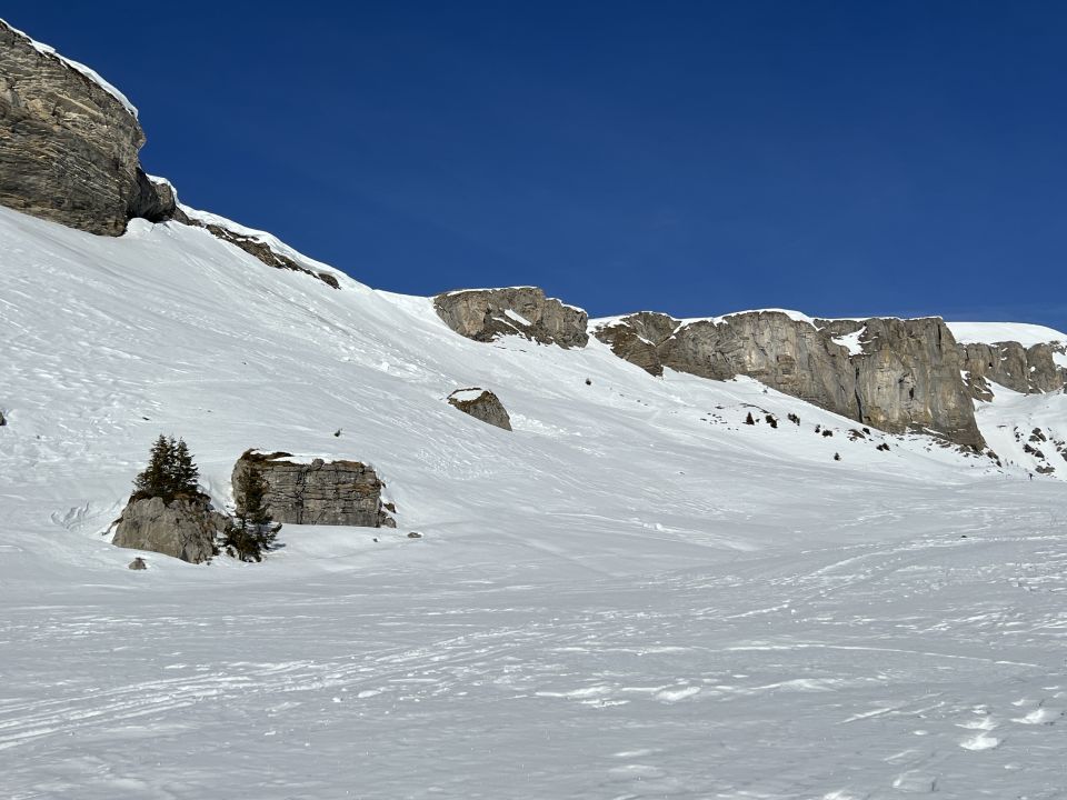 ging gut ohne Harscheisen, Talabfahrt zur Stöckalp gut, Stufen in die Wächte zum Bonistock eingearbeitet (s. Bild), Route zum Hohmad sehr hart und vereist (daher umgekehrt); grundsätzlich sehr harter Schnee, häufig vereist