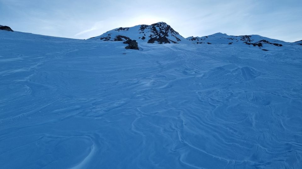 Gute Spur ab Parkplatz bis zum Gipfel. Ab ca. 2200m Harscheisen angenehm aufgrund der harten, teils eisigen Spur. Schnee ist stark windbearbeitet und brett-hart. Die Windgangeln haben teilweise eine eindrucksvolle Grösse.