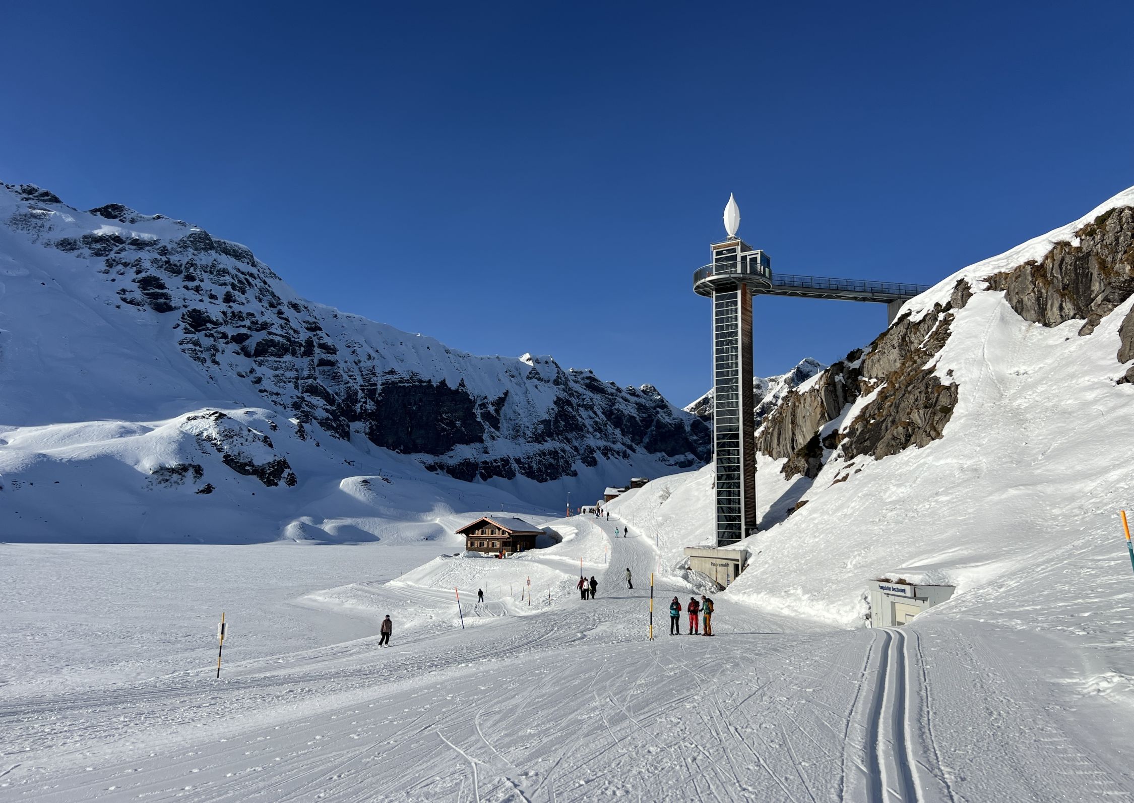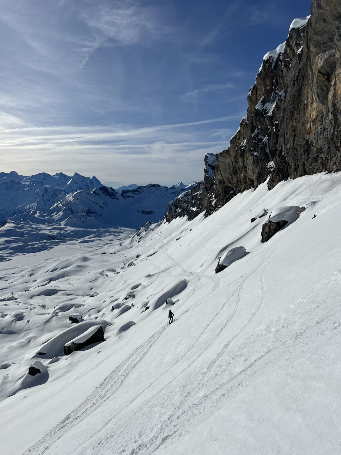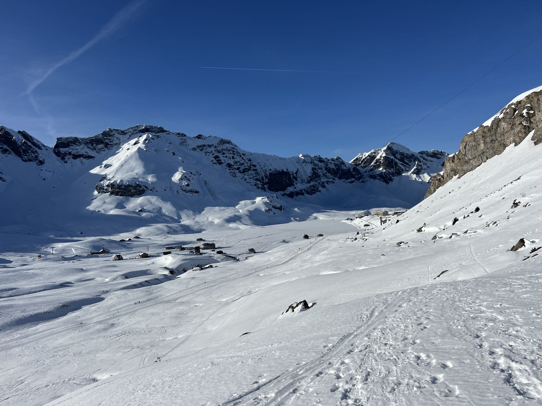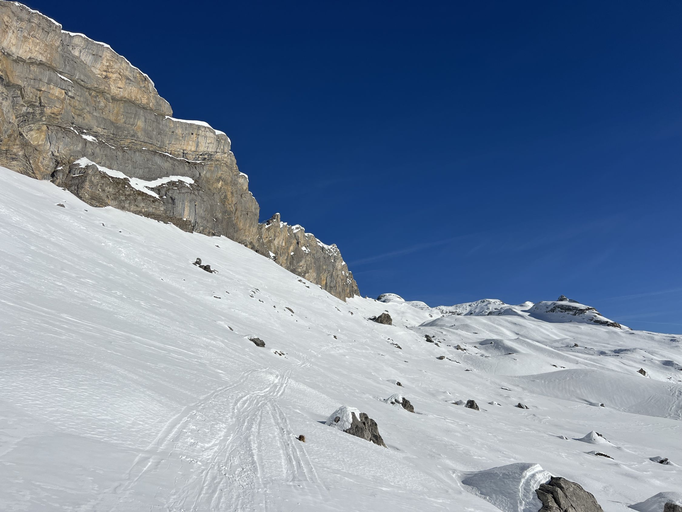 Durchgehende griffige (ohne Harsteisen) Aufstiegsspur auf harter, teilweise bereits leicht angesulzener Unterlage. Perfektes Timing bei der Südabfahrt (ca 13.15 Uhr), schöne Sulzverhältnisse angetroffen. Via Chringen hoch zum Bonistock und entlang den (oft harten und vereisten) Skipisten runter zur Stöckalp. Durchgehend Schnee.
