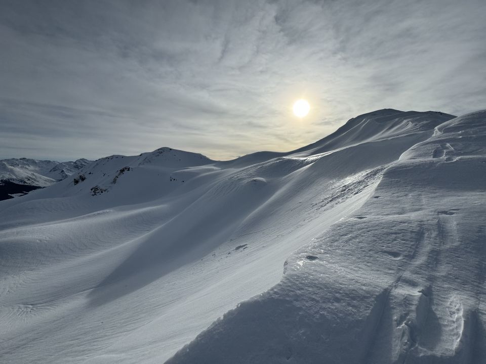 Auf dem Grat kurz vor dem Gipfel nach Ost via Lochalp nach Davos abgefahren. Der Wind und die Sonne haben Ihre Spuren hinterlassen. Nur noch vereinzelt ein Hauch Pulver in flachen Senken. Bei Pulver ist dies eine tolle Abfahrt. PS: Für weniger Ortskundige empfiehlt sich ab Lochalp die Abfahrt nordwärts auf der Waldtrasse.
