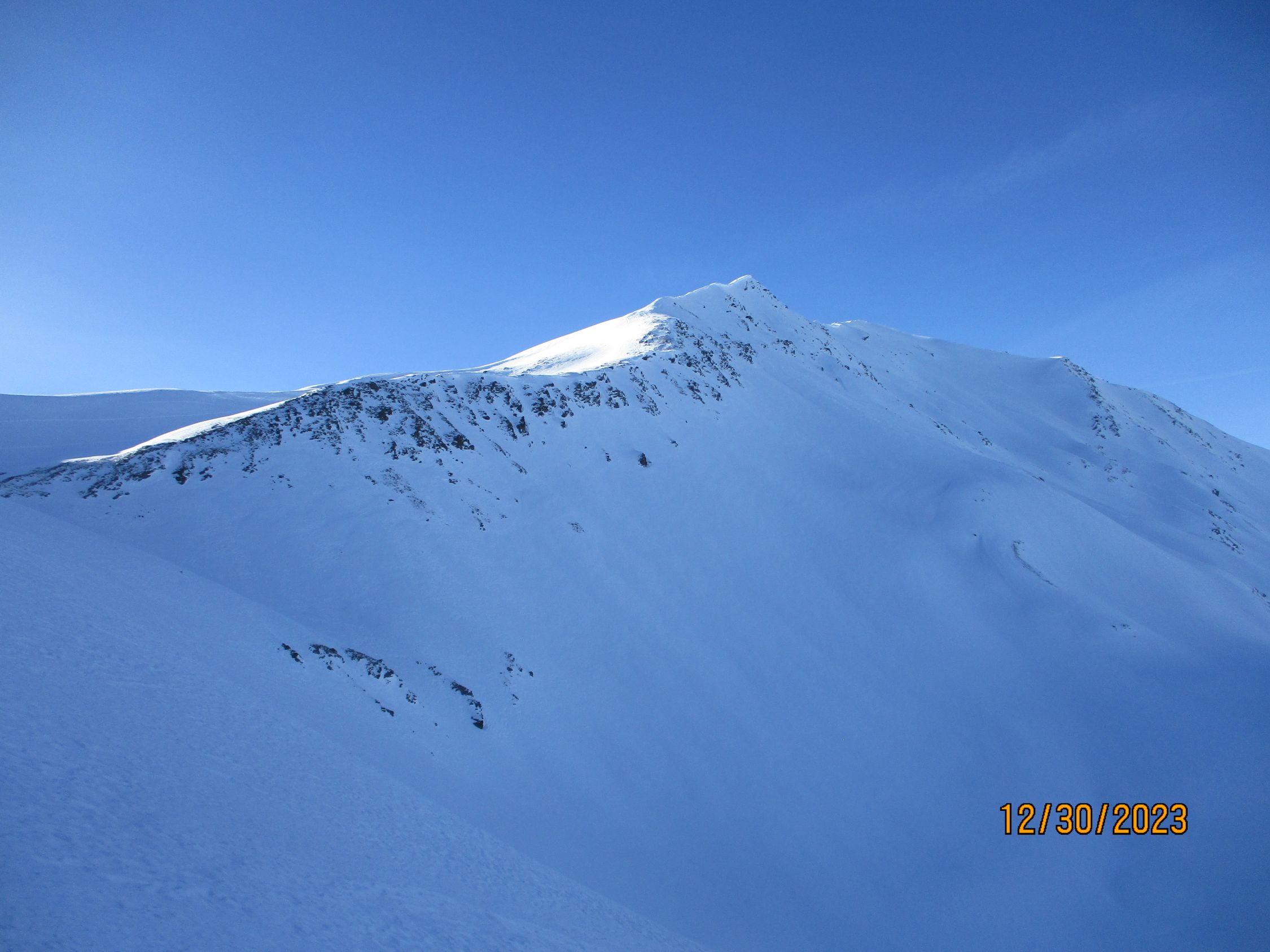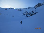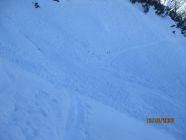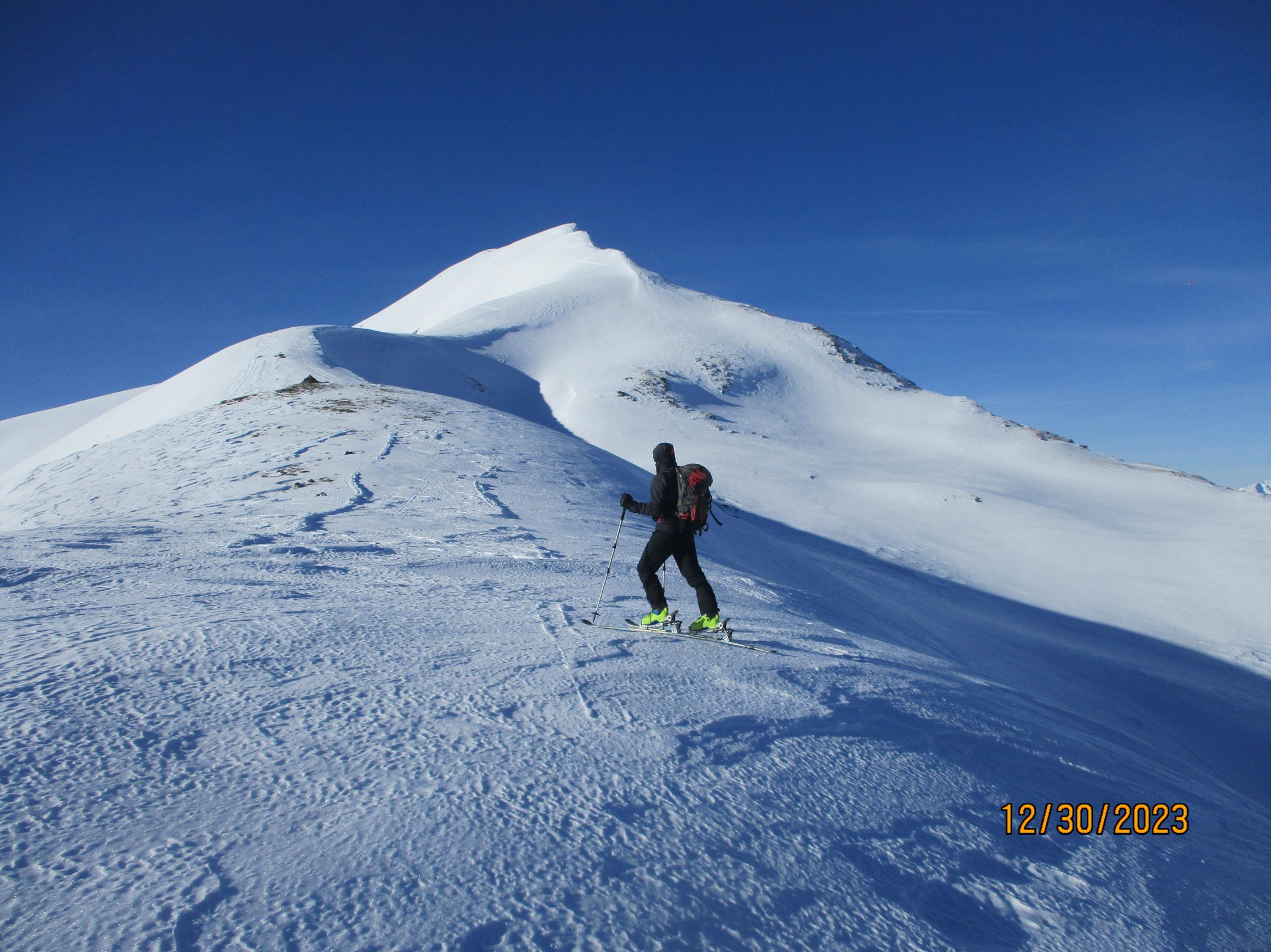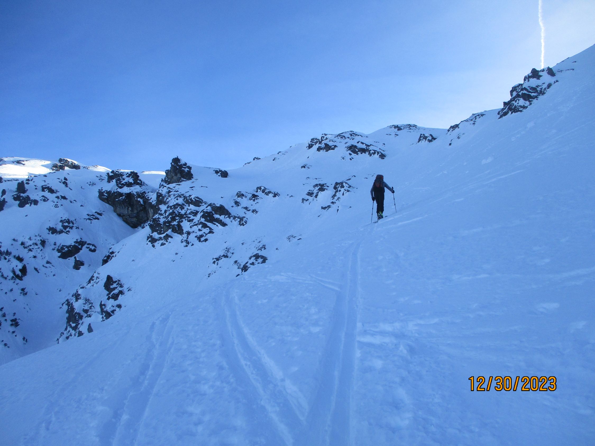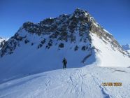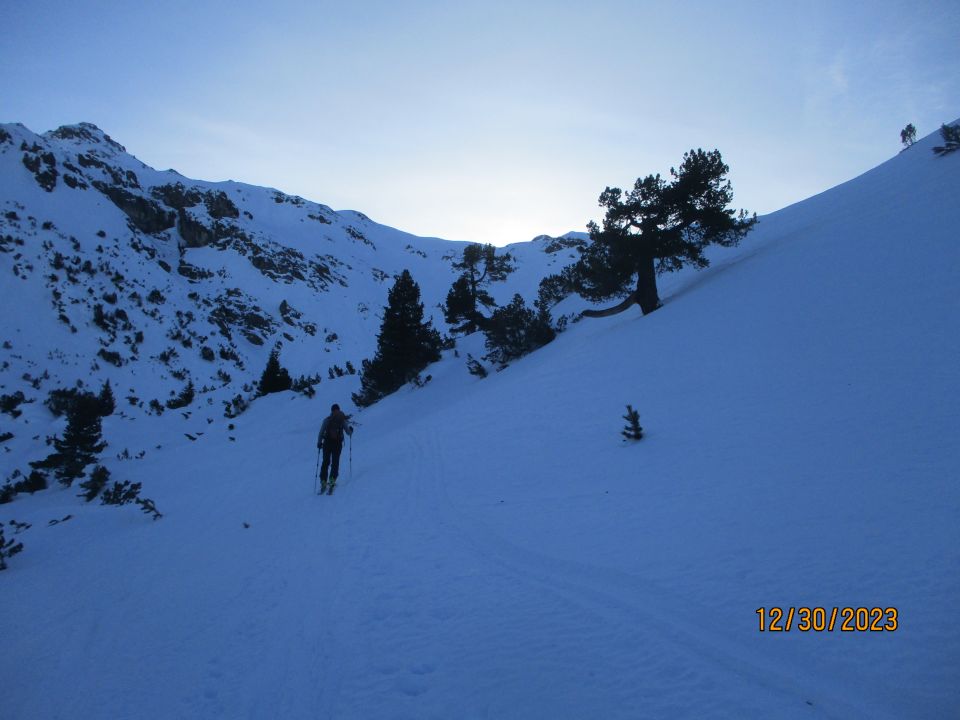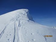 Sehr günstige Schneeverhältnisse für Schneeschuhe. Griffig im Anstieg, flowig im Abstieg, ohne Durchrutschen selbst in den steilsten Partien. Nur selten mal eine holprige Hartschneestelle. Die Oberflächenkonsistenz des Schnees lag meist zwischen pulvrig und etwas feucht, gelegentlich mit einer dezenten Kruste. Heute auch für Vladi auf Skiern ein Vergnügen.