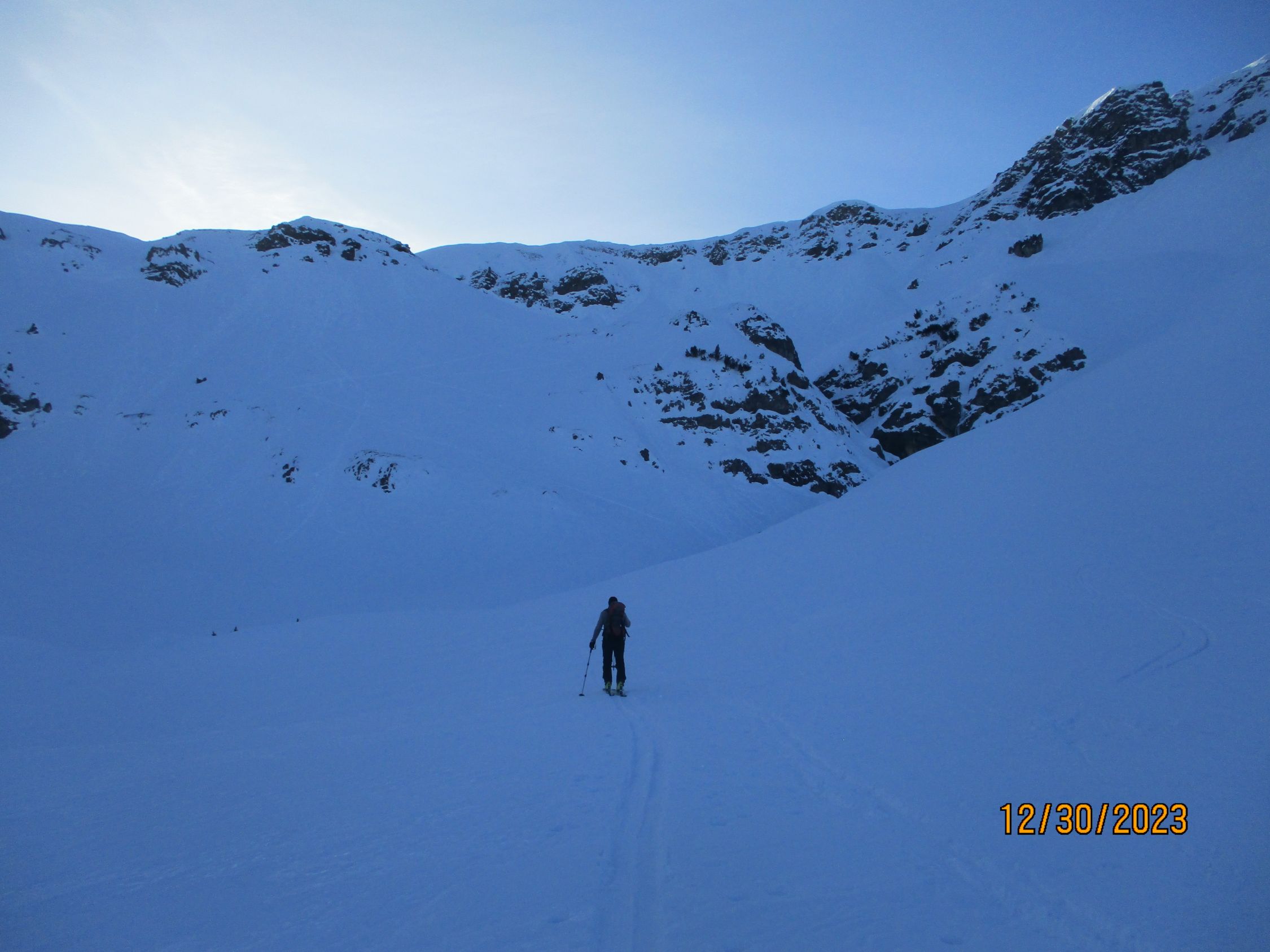 Lebhafter Südwind ab etwa Alteinerseeli. In der Folge Verfrachtungen in die steilen Hänge unterhalb des Grates der Valbella Furgga, weshalb eine bedachte Wahl der Abstiegsroute angezeigt war.