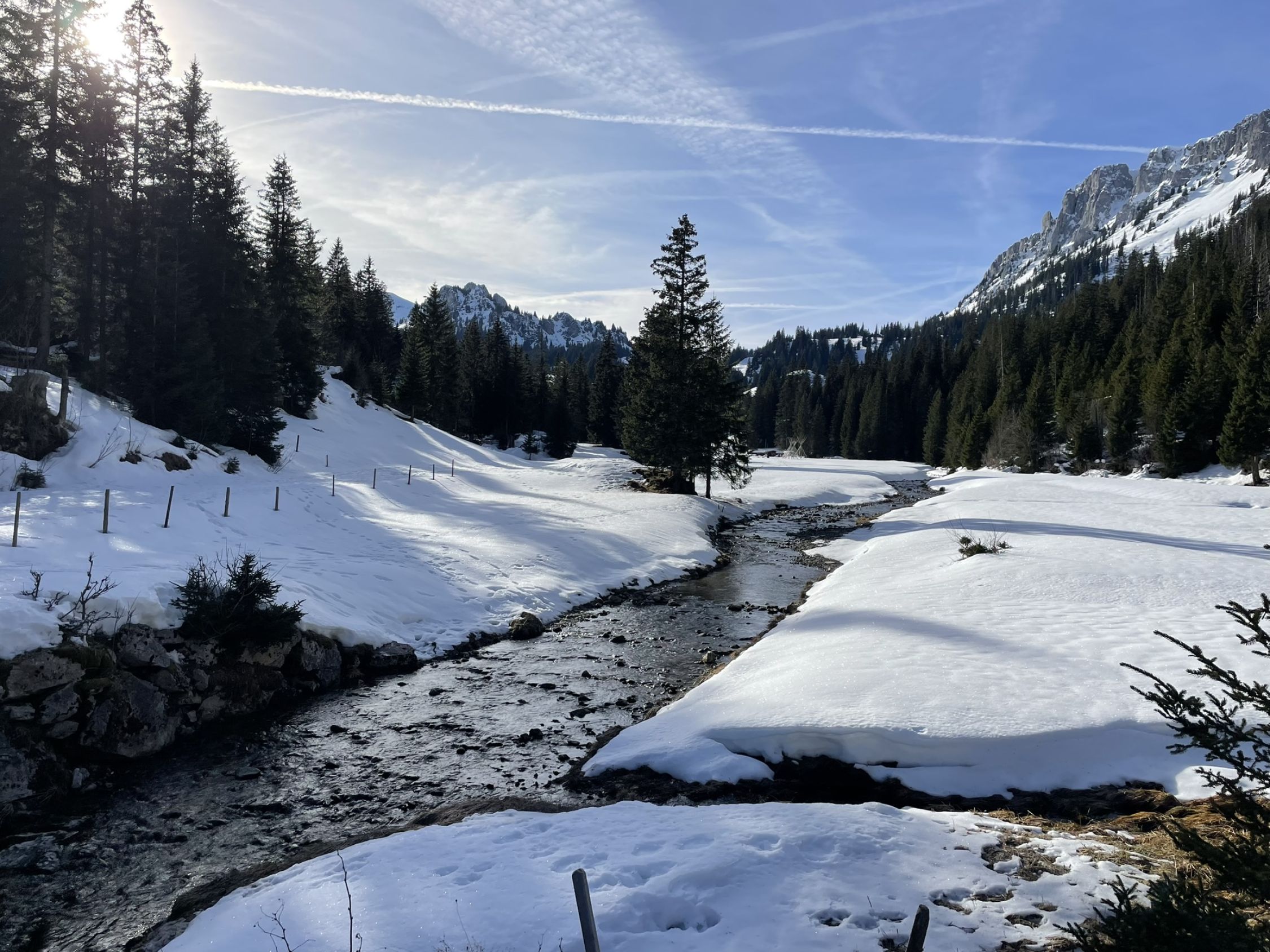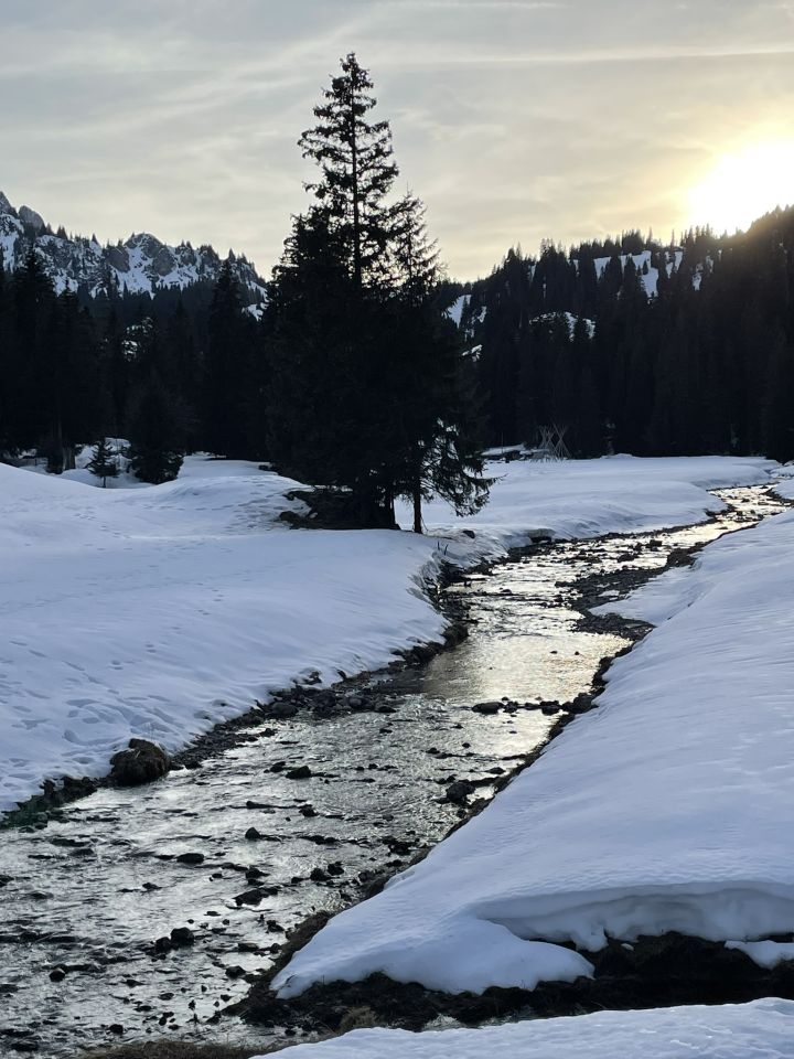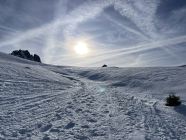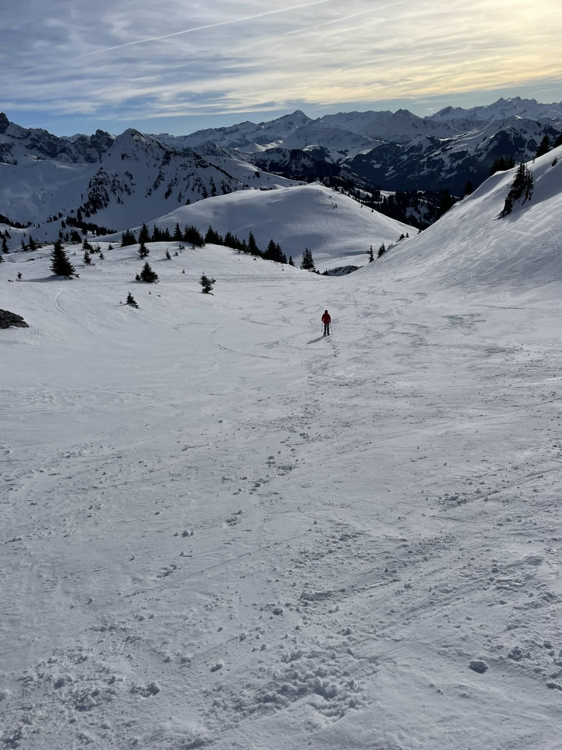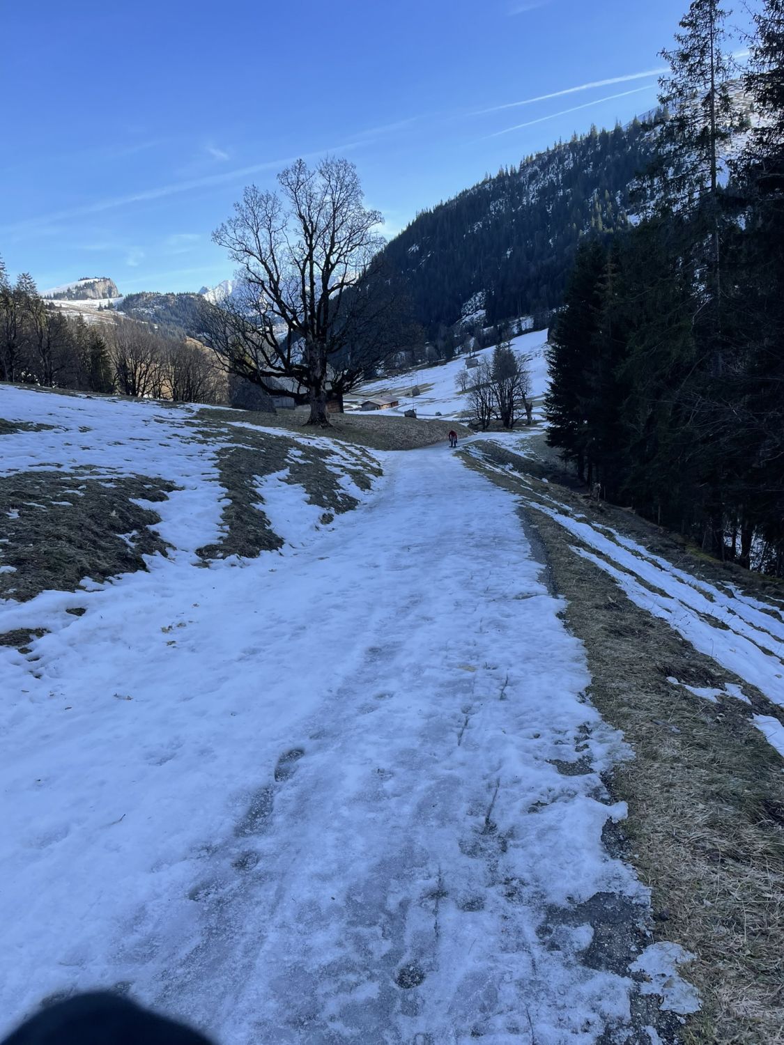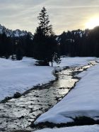 Strasse erste 300 meter tragen, am besten heute neben der Strasse wg. dünner Eisauflgane. Dann mir kurzen Unterbrechungen über gefrorenen Schnee bis Gipefl und zurück. Abfahrt nichts tolles aber Lichtstimmung und Landschaft wie immer schön. Viele Hütten für Sylvesterfeiern belegt.