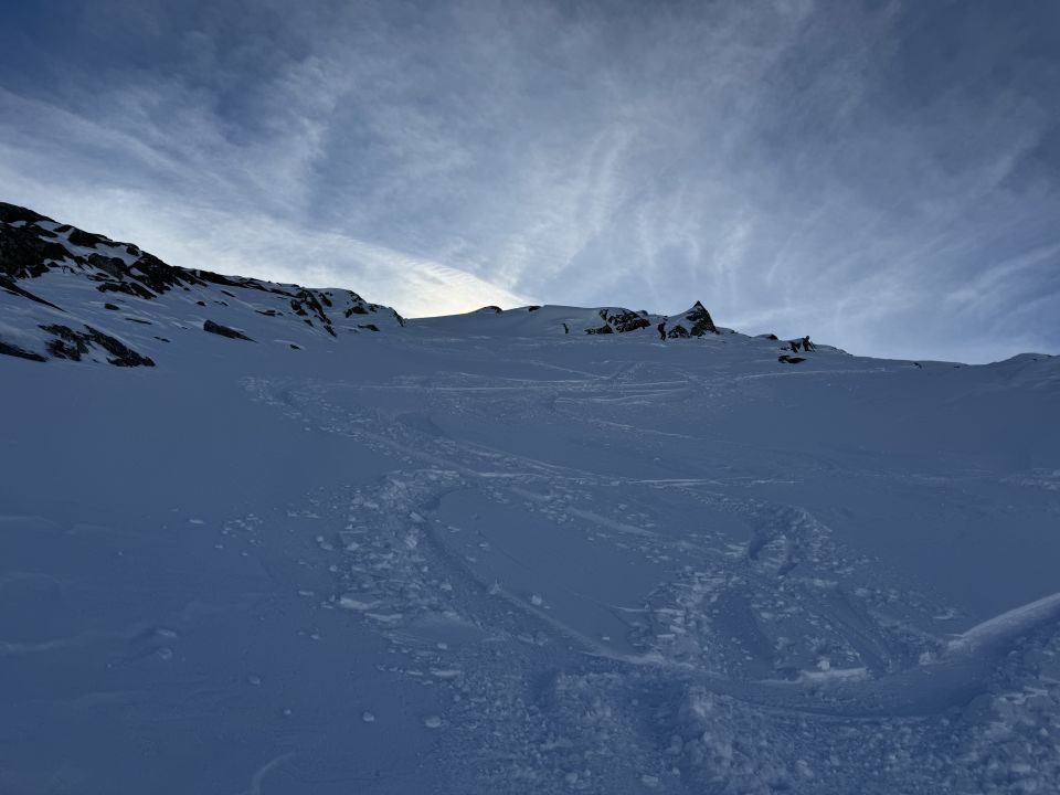 Heute perfektes Skitour-Wetter. Dank Schneefall in der Neujahrsnacht 10cm Neuschnee auf dem eisigen Untergrund. Im Gipfelbereich ist der Pulverschnee teilweise vom Wind abgeblasen. Bei der Abfahrt wechseln deshalb eisige Abschnitte mit Pulverschnee, der in Mulden auch tiefer sein kann.