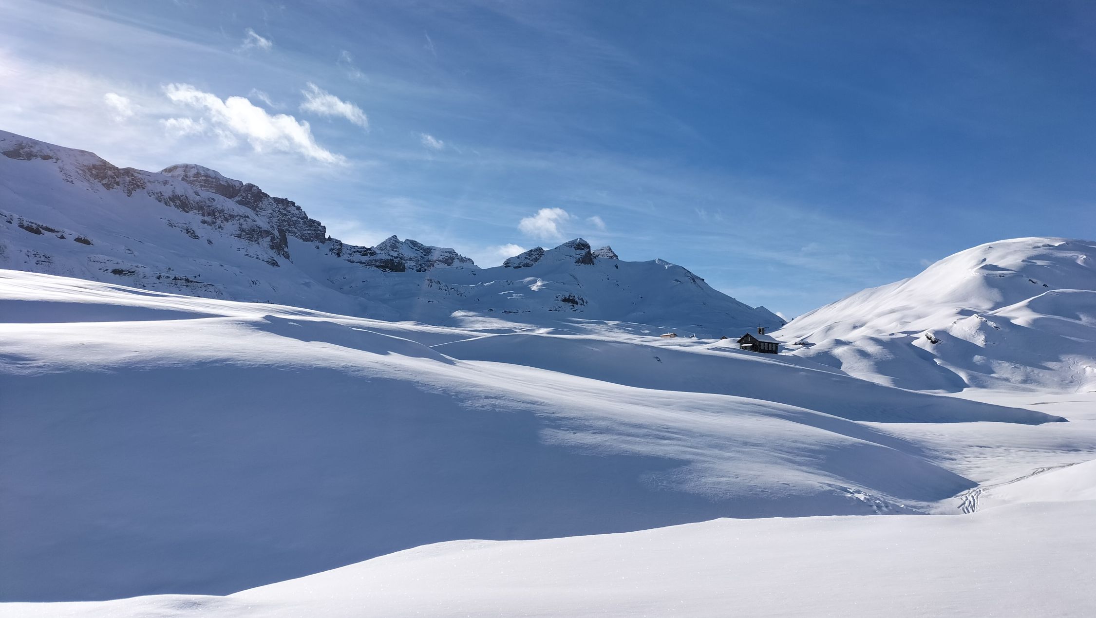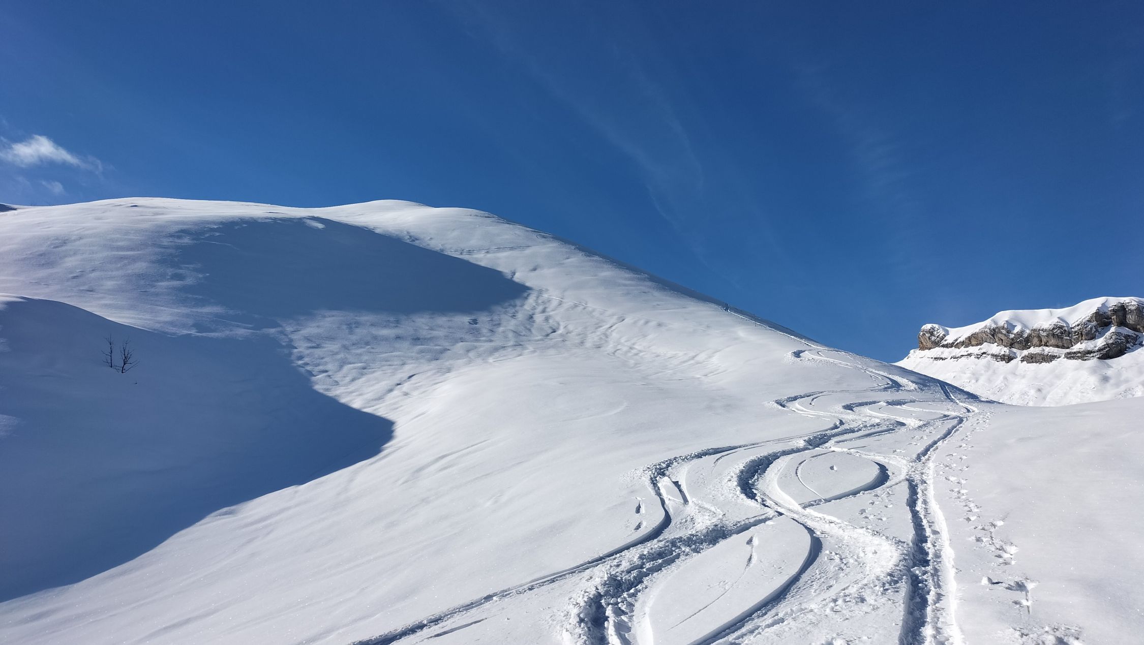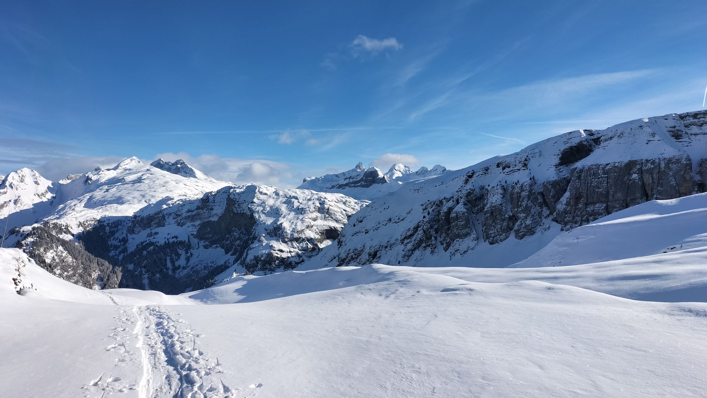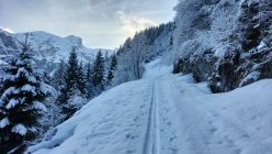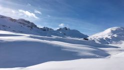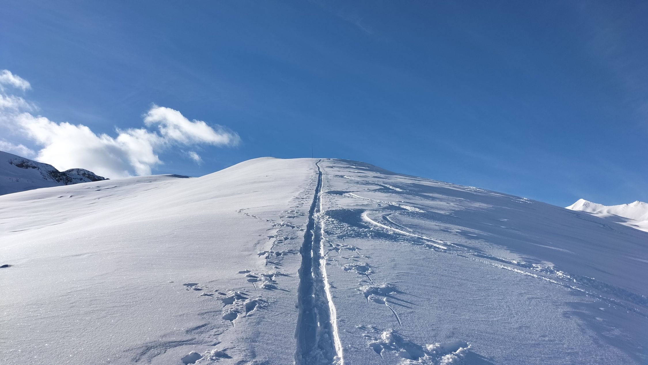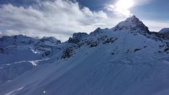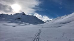 Start der Tour am 9 Uhr beim Schwarzenbach, bei schönem Wetter, die Ski können etwa nach 400 Meter montiert werden, dann gute Verhältnisse vorgefunden, es gab durchwegs rund 10 cm. Pulverschnee, der Gipfelhang schon vom Winde verweht.