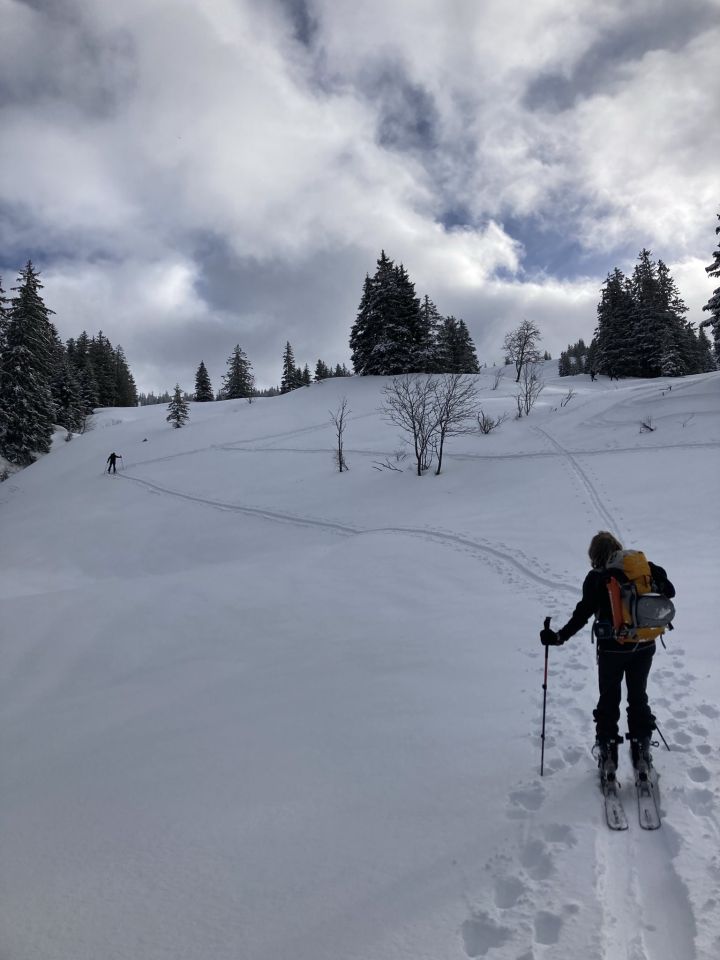 Gipfel stürmisch um 0 Grad. Abfahrt oben windgepresst, Mittelteil Pulver, unten pappig.