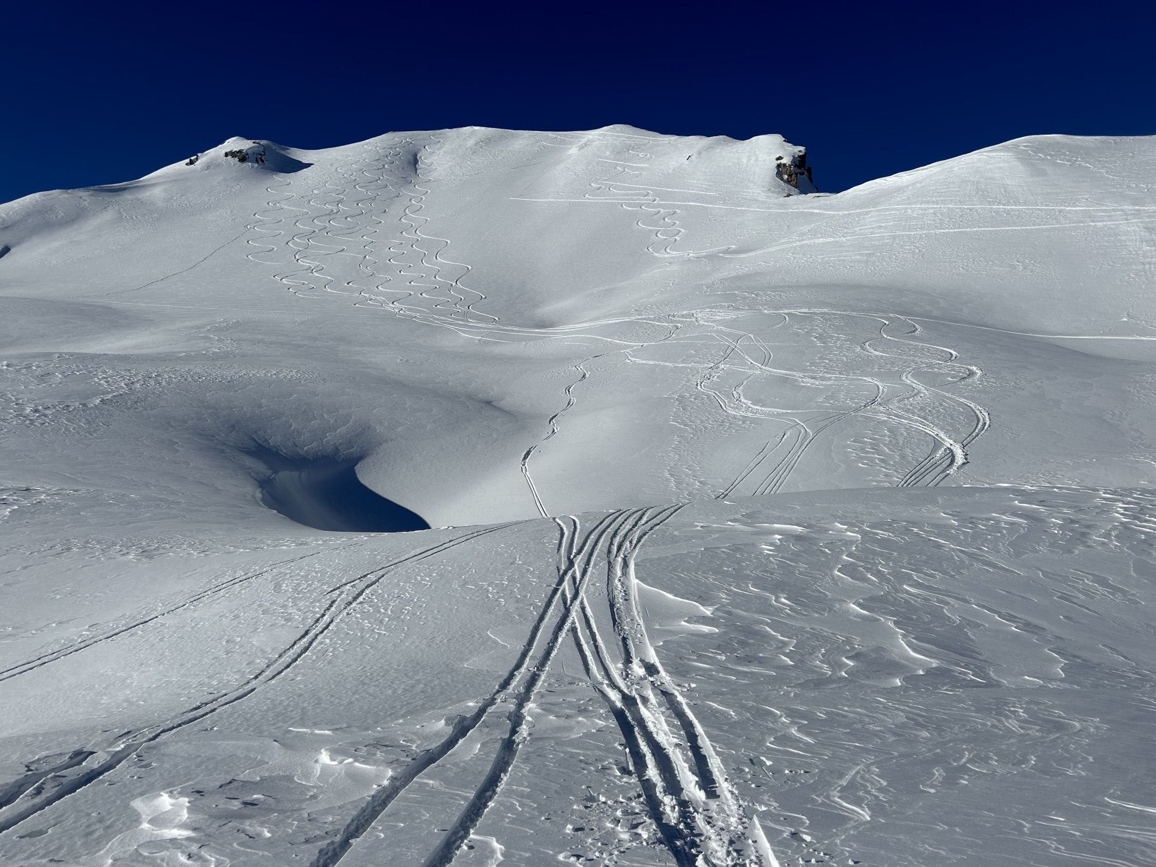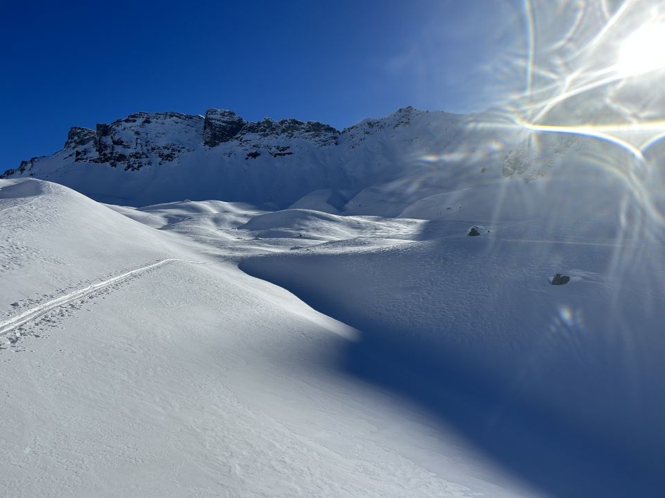 Ich bin bei der Abfahrt auf 2000m die Flanke hinab zum Tobel gefahren, der gerade so mit genügend Schnee gefüllt ist.