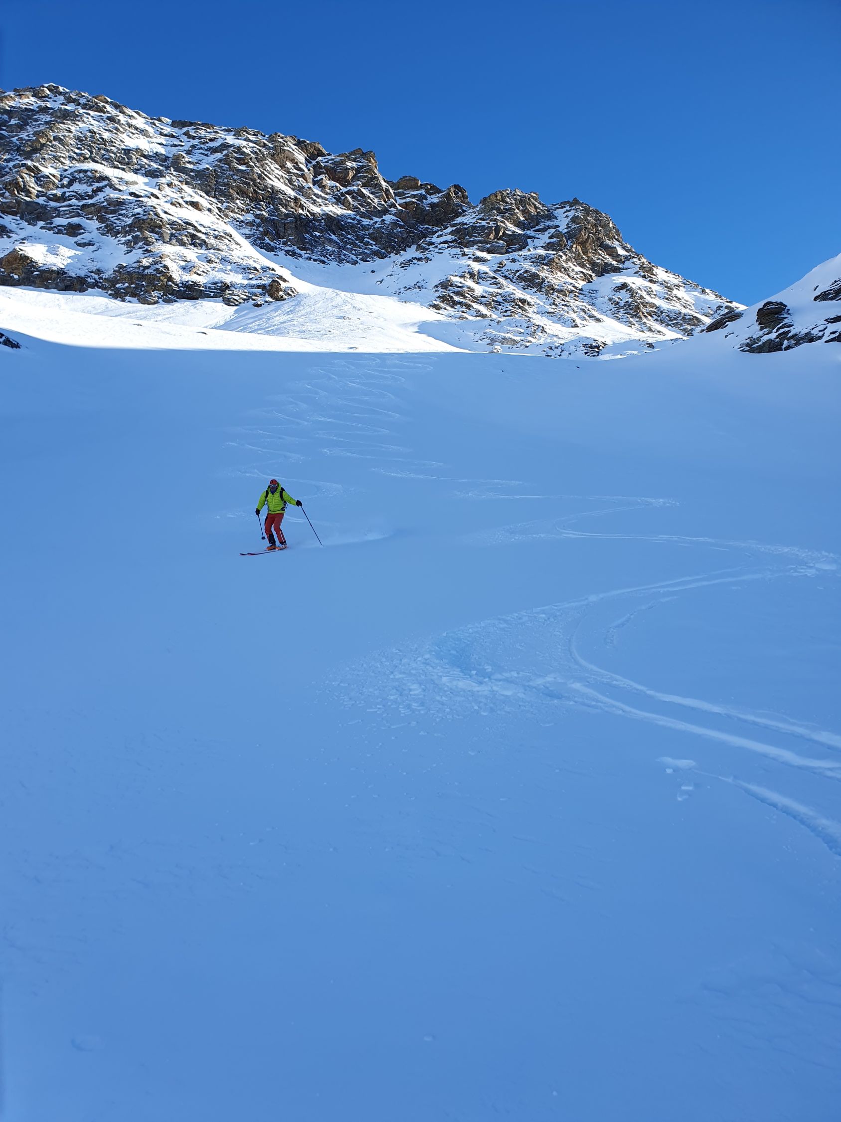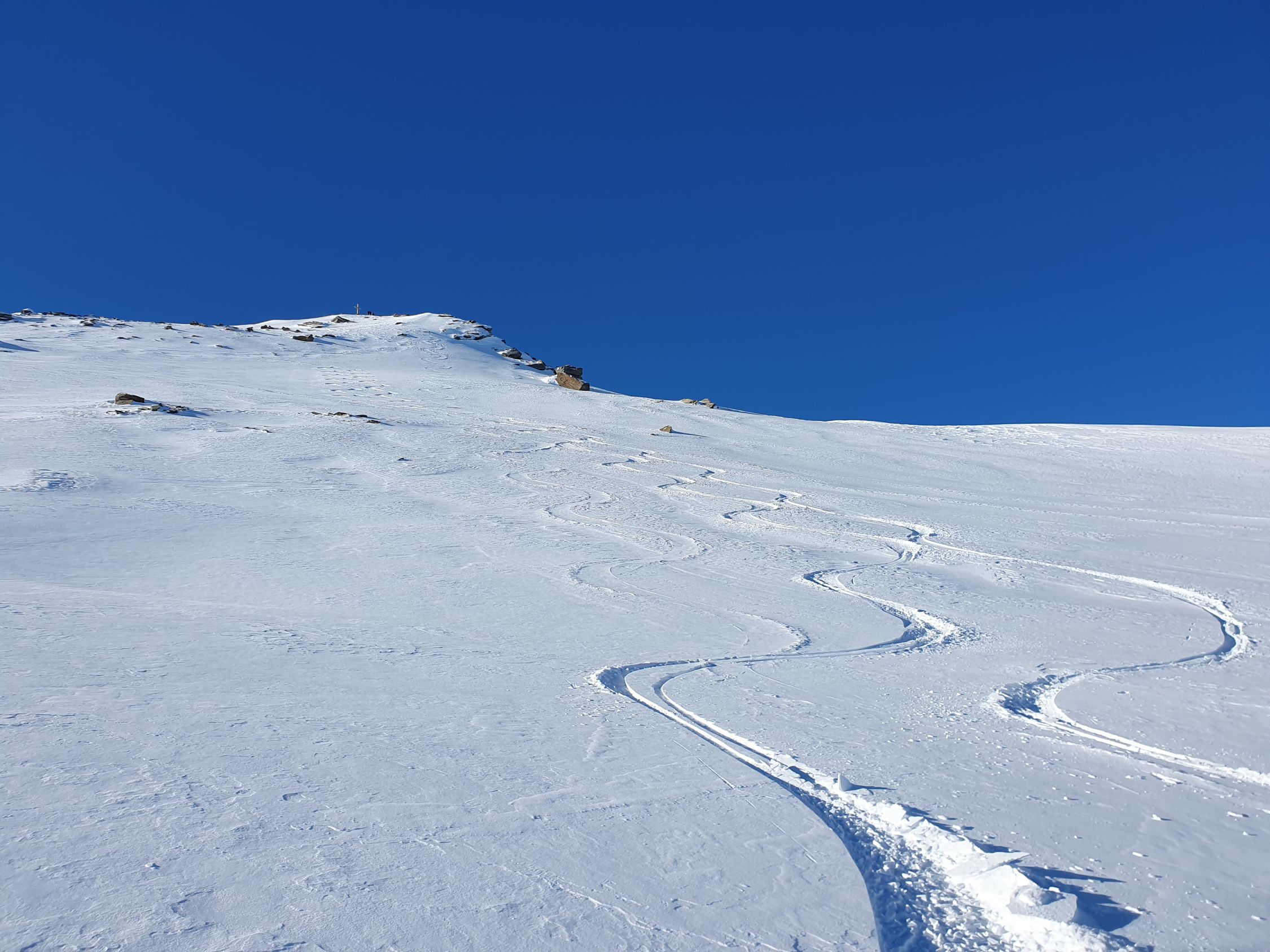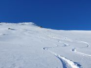 Gute Aufstiegsspur vorhanden, im Gipfelbereich ist die Spur zum Teil abgeblasen, daher können Harscheisen von Vorteil sein. Runter gings über die Ostflanke zum Fanellgrätli. Bis dort 15cm Pulver auf harter Unterlage, zum Guraletschsee etwas wechselhsfter, danach wieder schöner Pulver auf harter Unterlage.