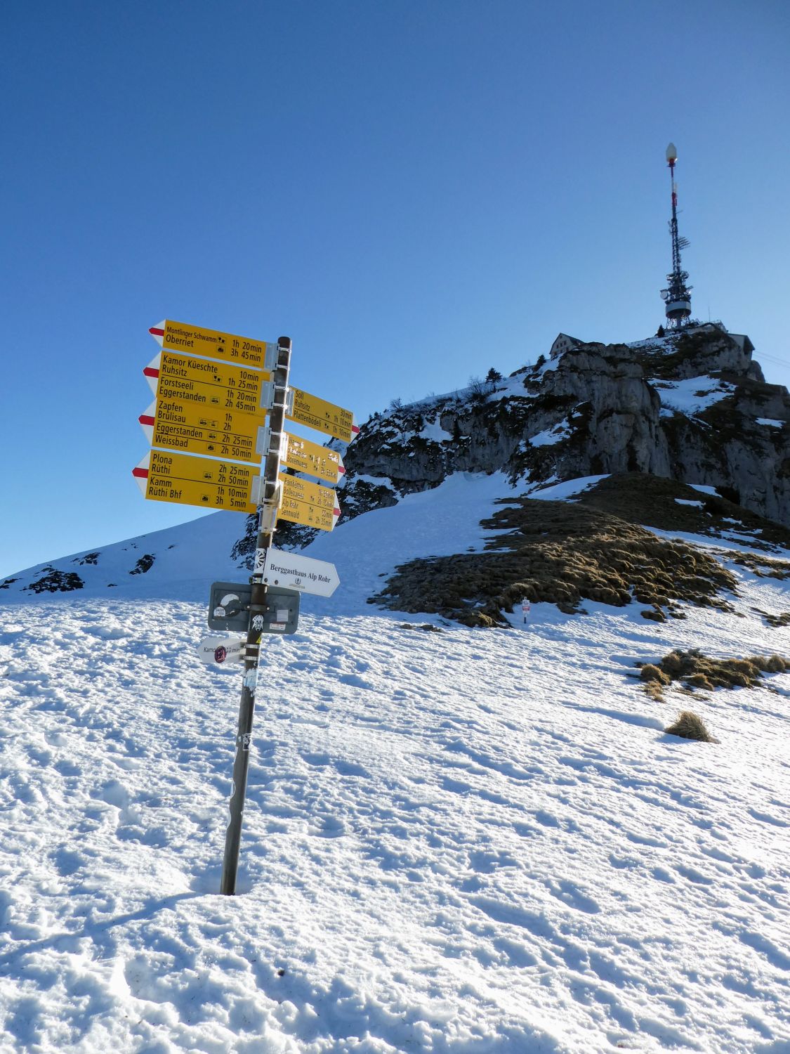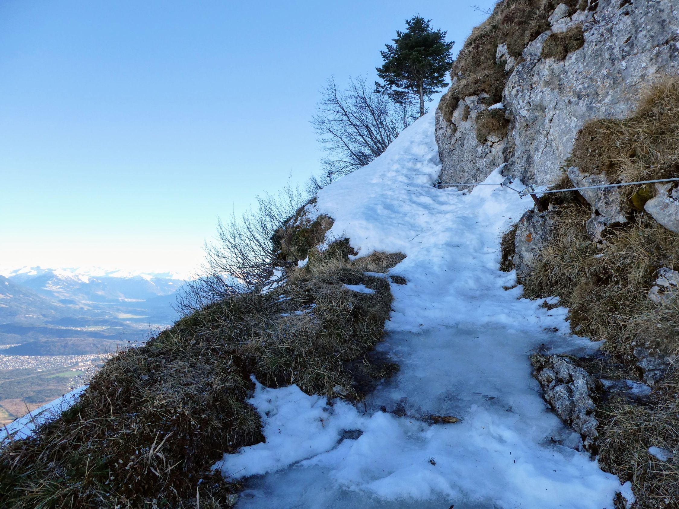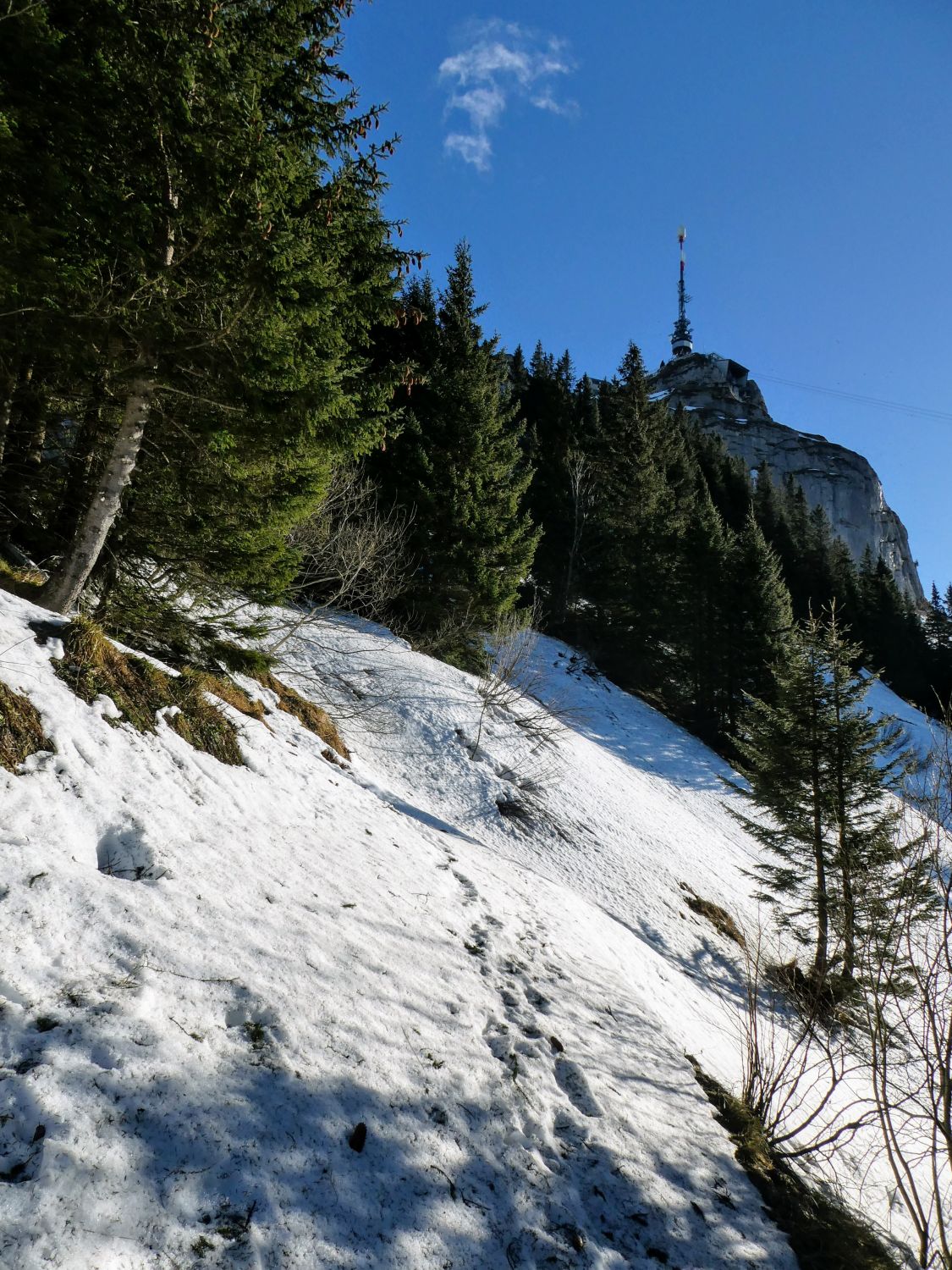 Der direkte Aufstieg über das Chatzetöpli zum Hohen Kasten ist ebenfalls stark vereist und die Stahlseile liegen z.T. im Schnee. Hier sind also auch Steigeisen und Vorsicht gefragt.