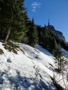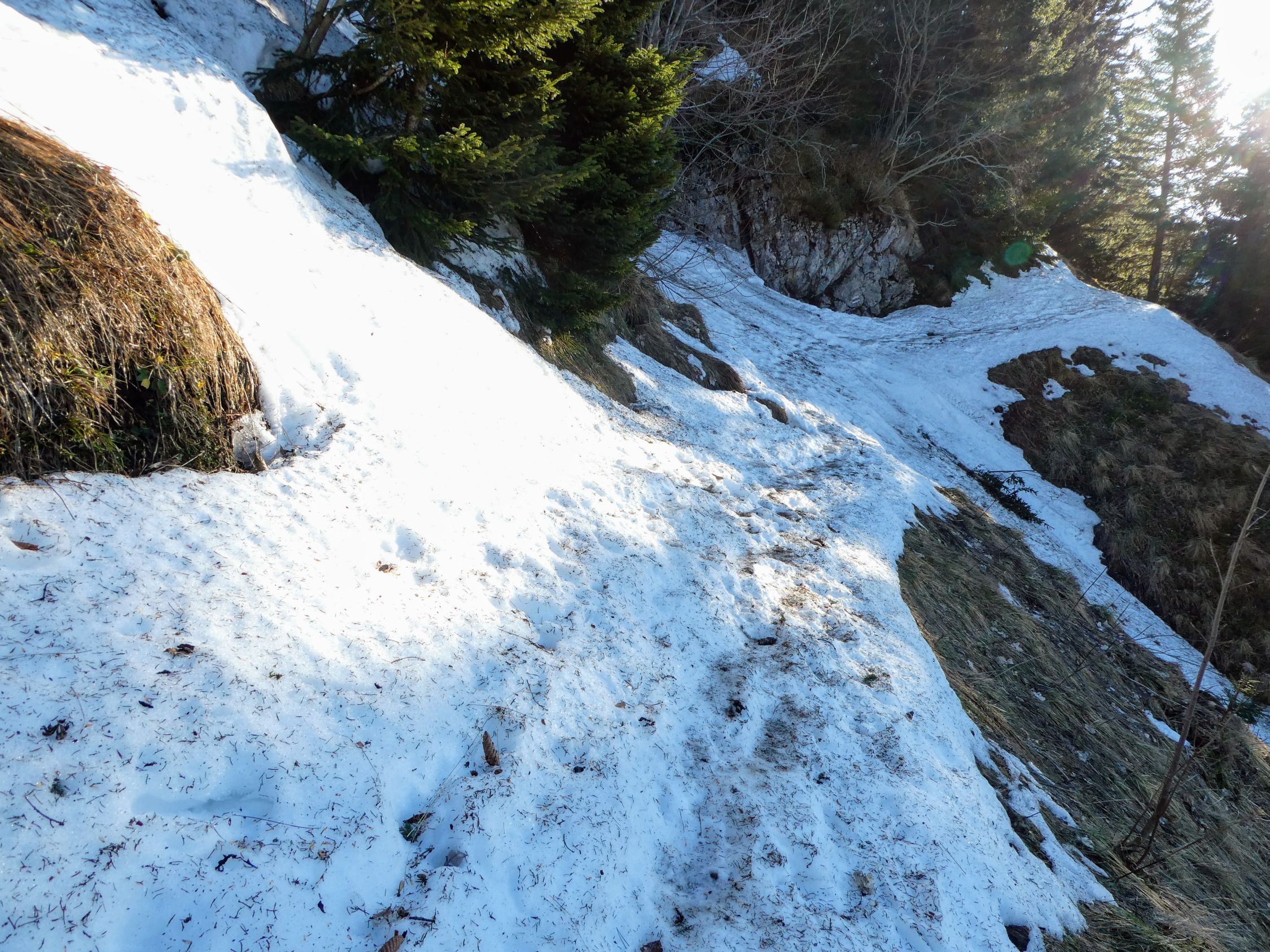 Schneekontakt gibt es aktuell erst oberhalb vom Ruhsitz, Richtung Kastensattel. Der Schnee ist aber pickelhart. Ein Aufstieg ohne Steigeisen wäre momentan kritisch!