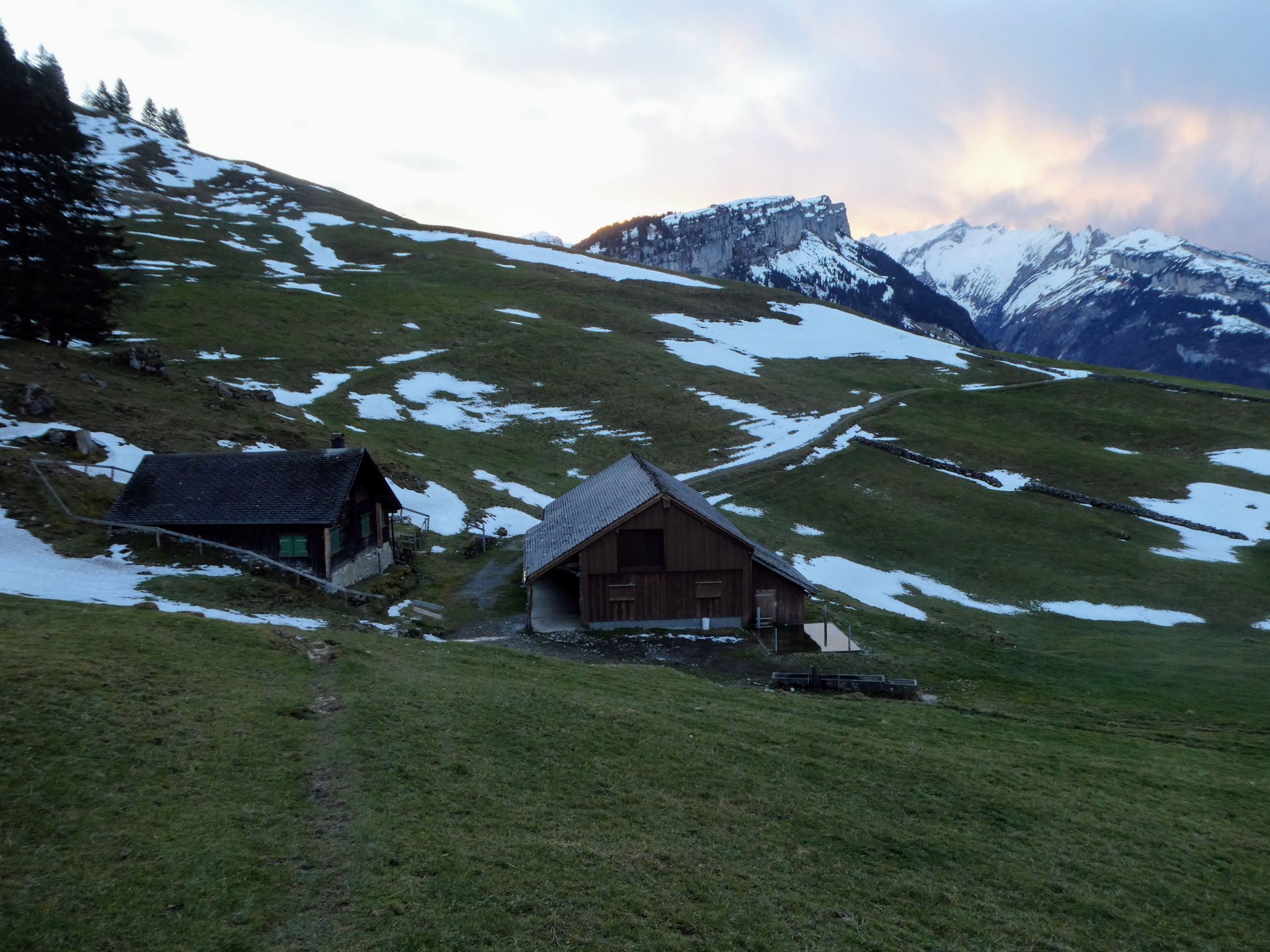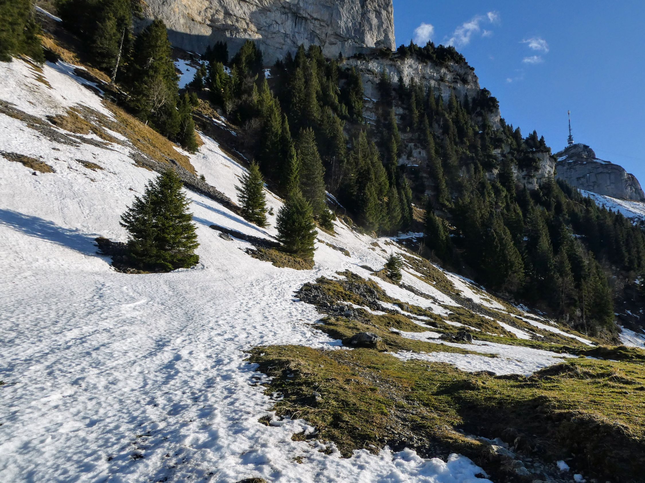 Am Übergang vom Kastensattel zum Kamor und dem Abstieg zum Schaienrossberg liegt auch harter Schnee. Nach dem Schaienrossberg ist wieder alles trocken und schneefrei.