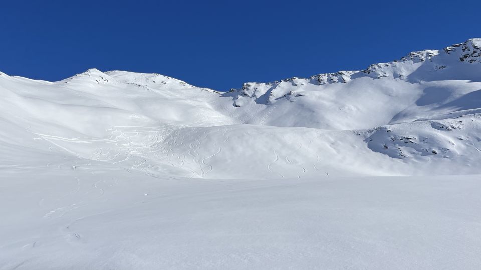 Wunderschöner Aufstieg durchs ruhige Matjischtälli in 15 bis 20 cm feinem Pulver auf unten harter, oben weicherer Unterlage.