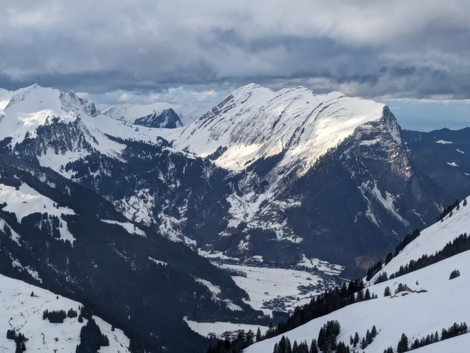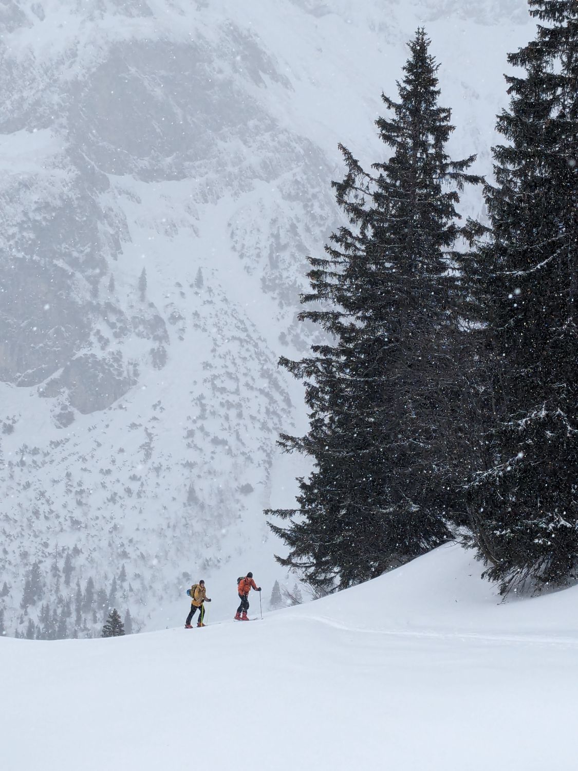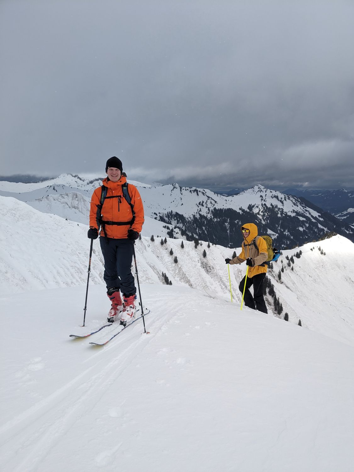 Noch immer sehr viel Schnee in Baad, aber nur sehr wenige Tourengeher. Bis hinter die Bärgunt-Hütte war die Unterlage nass, dann würde es zunehmend griffiger. Oberhalb der Jagdhütte frischer Pulverschnee, im Gipfelkar gut 20 cm. Sehr eindrucksvolle Wechten. Auch das Wetter war ein Traum ... anfangs bisschen Graupel, dann Wolkenlöcher mit Sonne, nachlassender Sturm. Toller Blick zum Widderstein, Hochkünzel, Kanisfluh, und Üntschen.