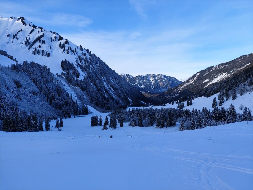Abfahrt: Die ersten 100 Hm vom Gipfel sind hart, Richtung Scheerizug, Mittelberg und Steibode hat es verblasenen Pulver. Man konnte bis zum Parkplatz abfahren.