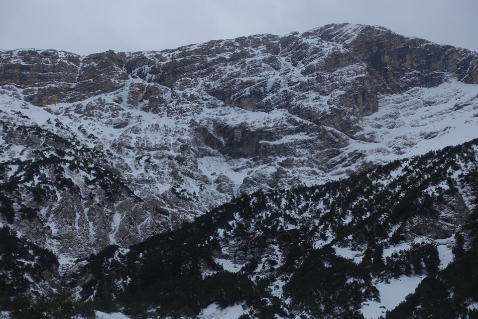 Zustieg: In der kurzen Waldpassage ab der Ammerwald Alm bis ins Kar kaum noch Schnee, paar Minuten Ski tragen. Dann wenig Hartschnee mit zu umkurvenden Steininseln bis etwa 1300m Ab dort ausreichend Unterlage mit zunehmend Neuschnee. Weitere Tragepassage 50hm durch den Latschengürtel ins obere Kar.