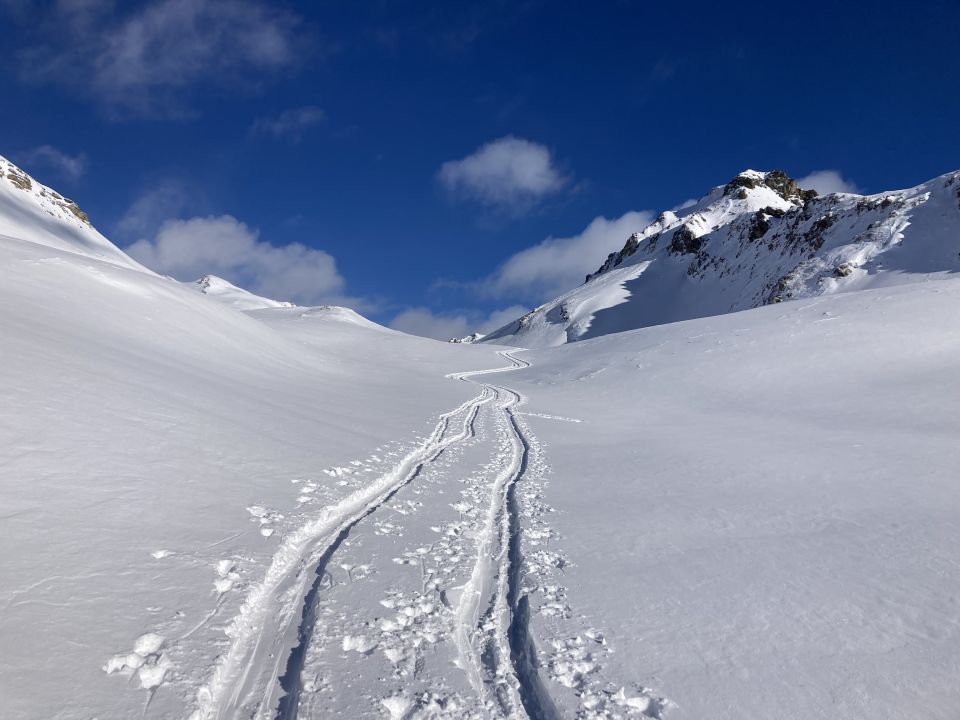 Im unteren Bereich schöne Schneeverhältnisse und gute Spur. Ab P. 2865 nördlich Corn zum Gipfel ist die Schneedecke sehr vom Wind gezeichnet. Für schöne Pulverschwünge lohnt sich ein Ausflug in die Osthänge des Valletta dal Güglia.