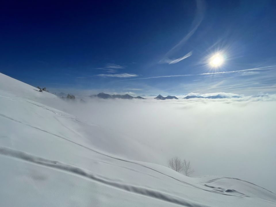 Ab 1500m dickster Nebel; ab 1800m über dem Nebelmeer bei Traumwetter und alleine am Gipfel. Südhänge bereits schwerer Schnee der vermutlich über Nacht frieren wird. Westliche Hänge mit perfekter Pulververhältnissen. Ein Traum!