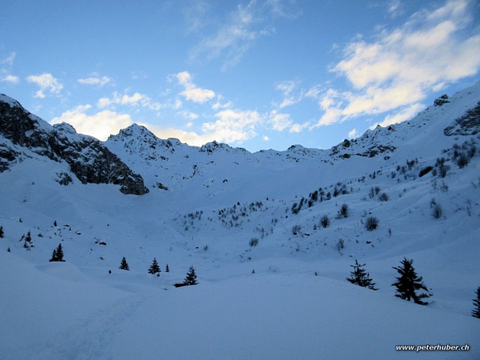 Abfahrt: Schöner Pulverschnee mit nur wenigen alten Spuren. Der steile Hang bei Pöschenwang war ein Traum. Bei ca. 1950 m haben wir wieder angefellt und sind zum Spitzenbüel aufgestiegen. Von dort schöne Abfahrt nach Dörfji. Auf dieser Strecke war der Schnee öfters etwas windgepresst und von der Sonne angefeuchtet. Auch da nur wenige alte Spuren. Die Sonne kam am Schluss nur noch bleich durch und das Licht wurde gelegentlich etwas fahl. Am Schluss auf gut ausgefahrener Route gut hinunter nach Rüti.