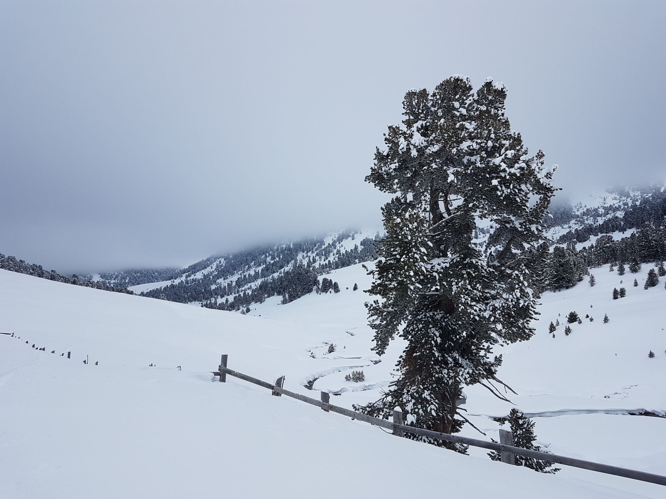 Es ging im Skigebiet Minchuns (Nähe Ofenpass) auf das Fuorcla Funtana da S-charl (2392 m). Einen Kilometer führte der Weg im widrigsten Nord-Wind und Whiteout zur Alp Astra. Der Wolkendeckel hielt sich hartnäckig bei 2300 m. Darunter war Sicht. Daher ging es ohne Gipfel-Besuch nach S-charl und weiter bis ans Nord-Ende in Scuol. Ab der Alp Praditschöl (2100 m) gibt es eine nutzbare Schneeschuh-Spur. S-charl ist im Winter ausschließlich über Pferdekutschen erreichbar und für KFZ gesperrt. Die Kutschen fahren auf einer geräumten Schneepiste. Für die Skitour kann man 6,5 Stunden einrechnen bis Bahnhof Scuol.