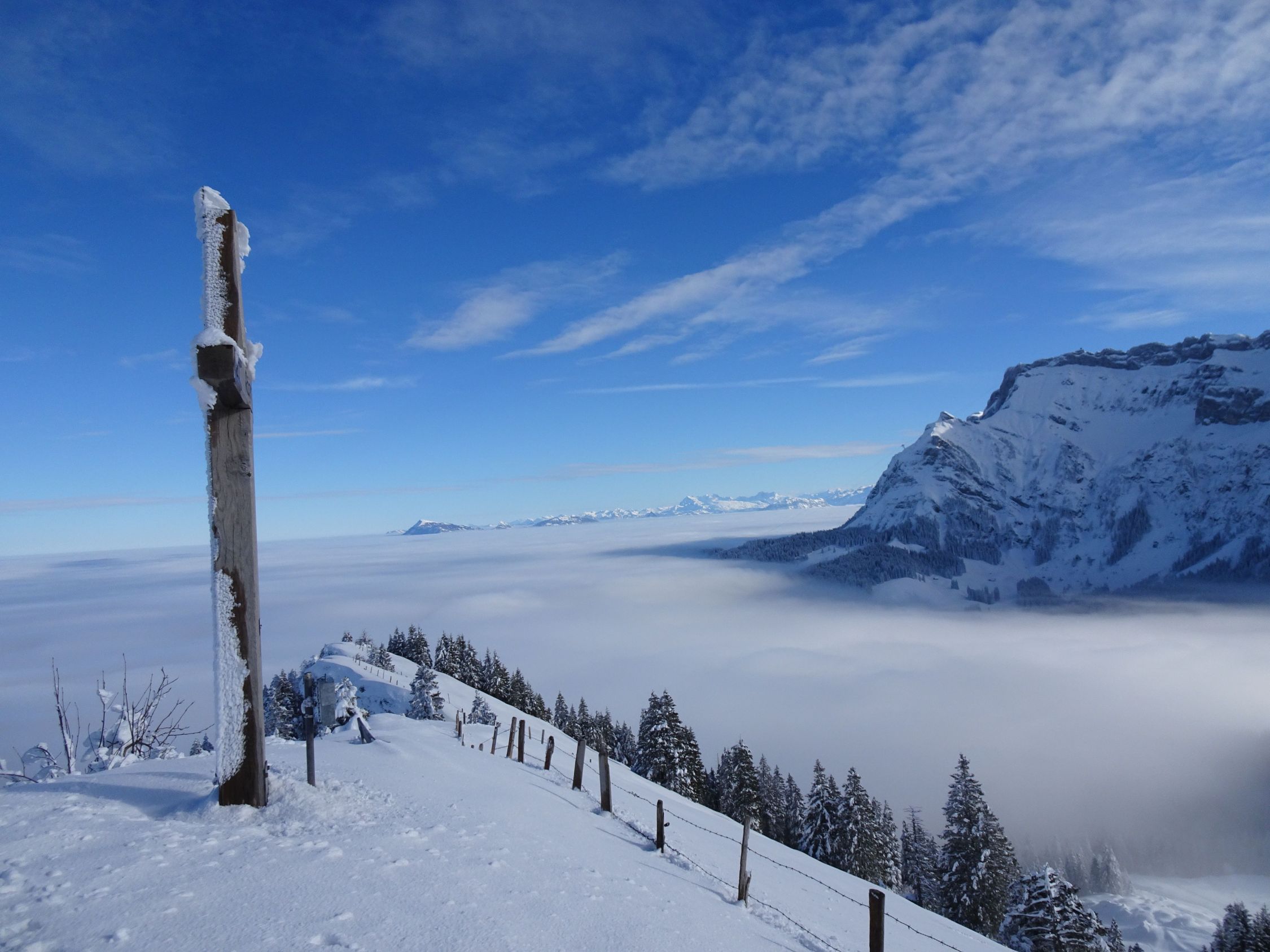 Start bei -7 Grad. Genug Schnee (Pulver) von unten bis oben. Der Schnee ist durch Windeinfluss nicht überall gleich tief, was aber nicht störte. Hochnebelschicht zwischen ca. 1200 und Alp Gumm. Breiter Schneeschuhpfad bis Gipfel. Rechtzeitig abfahren ist ratsam, da der Gipfelhang ab Mittag der $onne ausgesetzt ist.