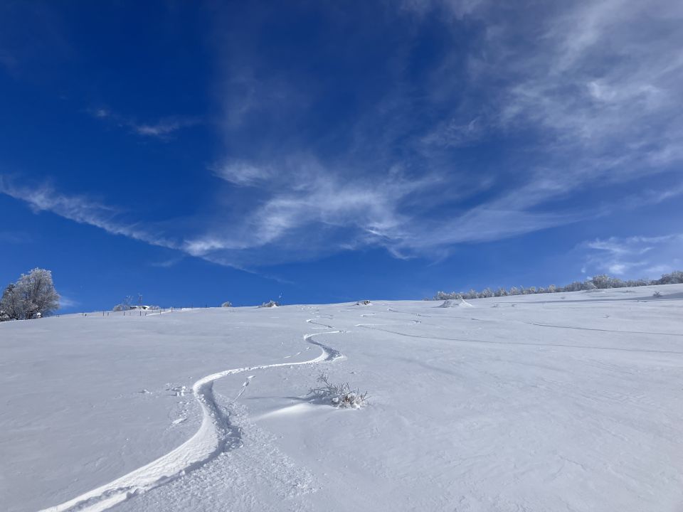 Abfahrt runter zur Scheltenstrasse war wunderbar via Grosse Rotmatt. Leicht feuchter Pulver, wo die Sonne rein schien, daher Stollenbildung beim Wiederaufstieg. Auf der Schattenseite alles locker und leicht.