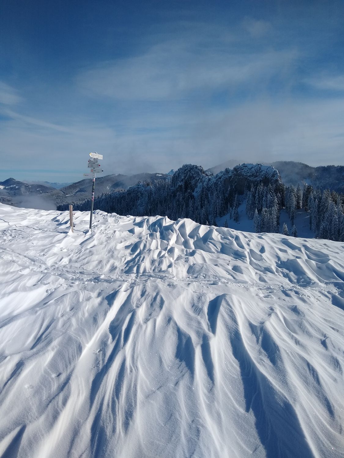 viel windbearbeitete Pulverschnee, mal locker mal gepresst.