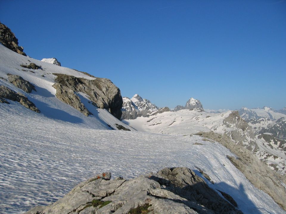 Aufstieg zurück zum Chammlijoch bei schon recht warmen Temperaturen. Nach einer längeren Pause via Iswändli und Tierälpli, auf schon etwas tiefem Sulz, zum Pass zurück. Tolle Frühsommer TourI
