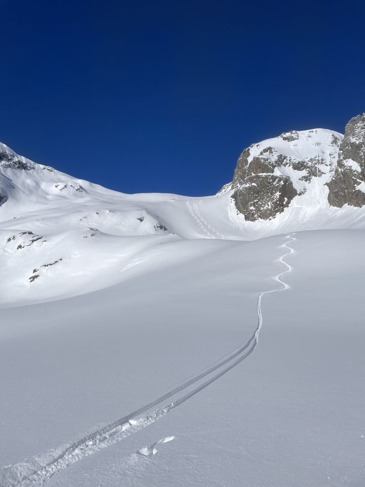 15-20 cm Pulver auf tragender Unterlage. Abfahrt via Chüefadenfirn bis 2500 super zu fahrender leicht feuchter Pulver. Unterhalb wird der Schnee mehr und mehr durchfeuchtet und gleitet auf der harten unterlage ab.
