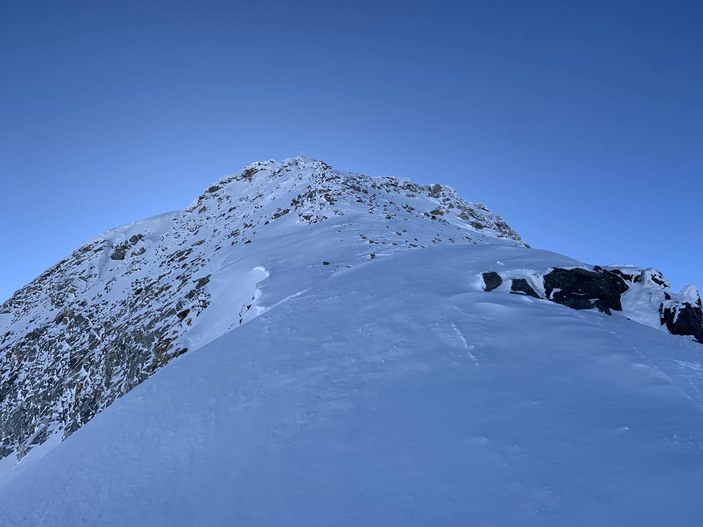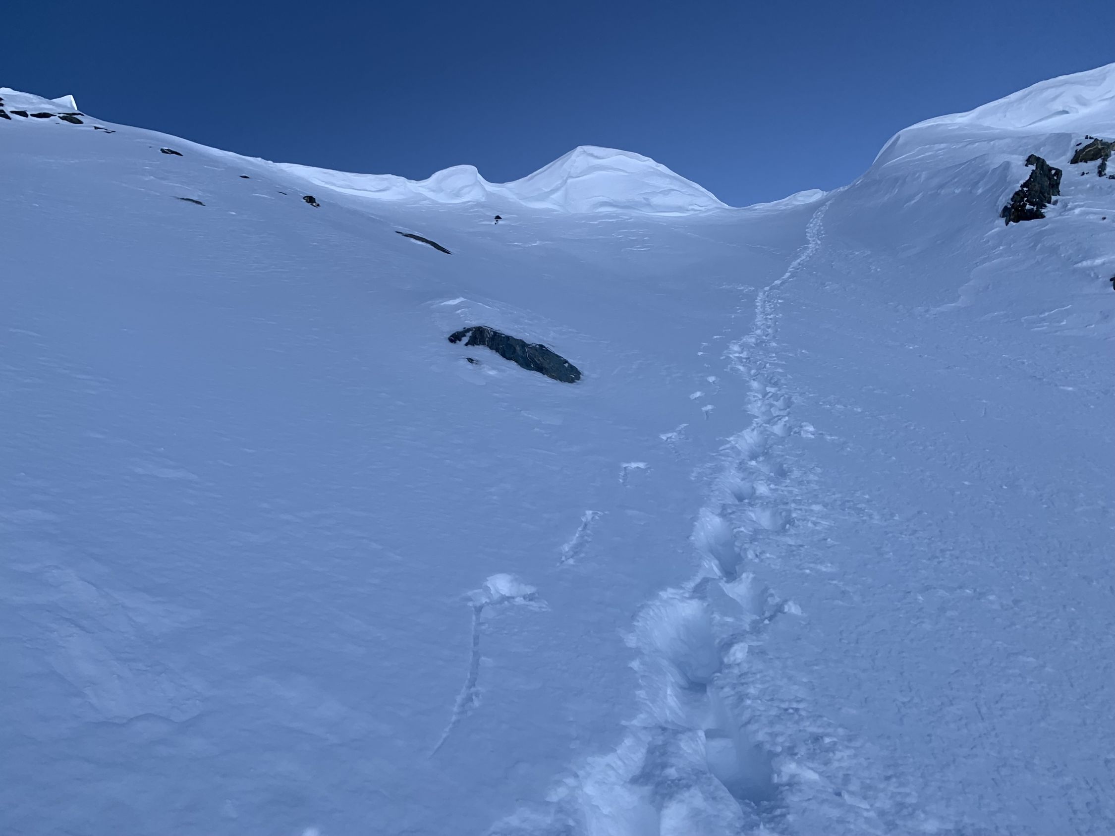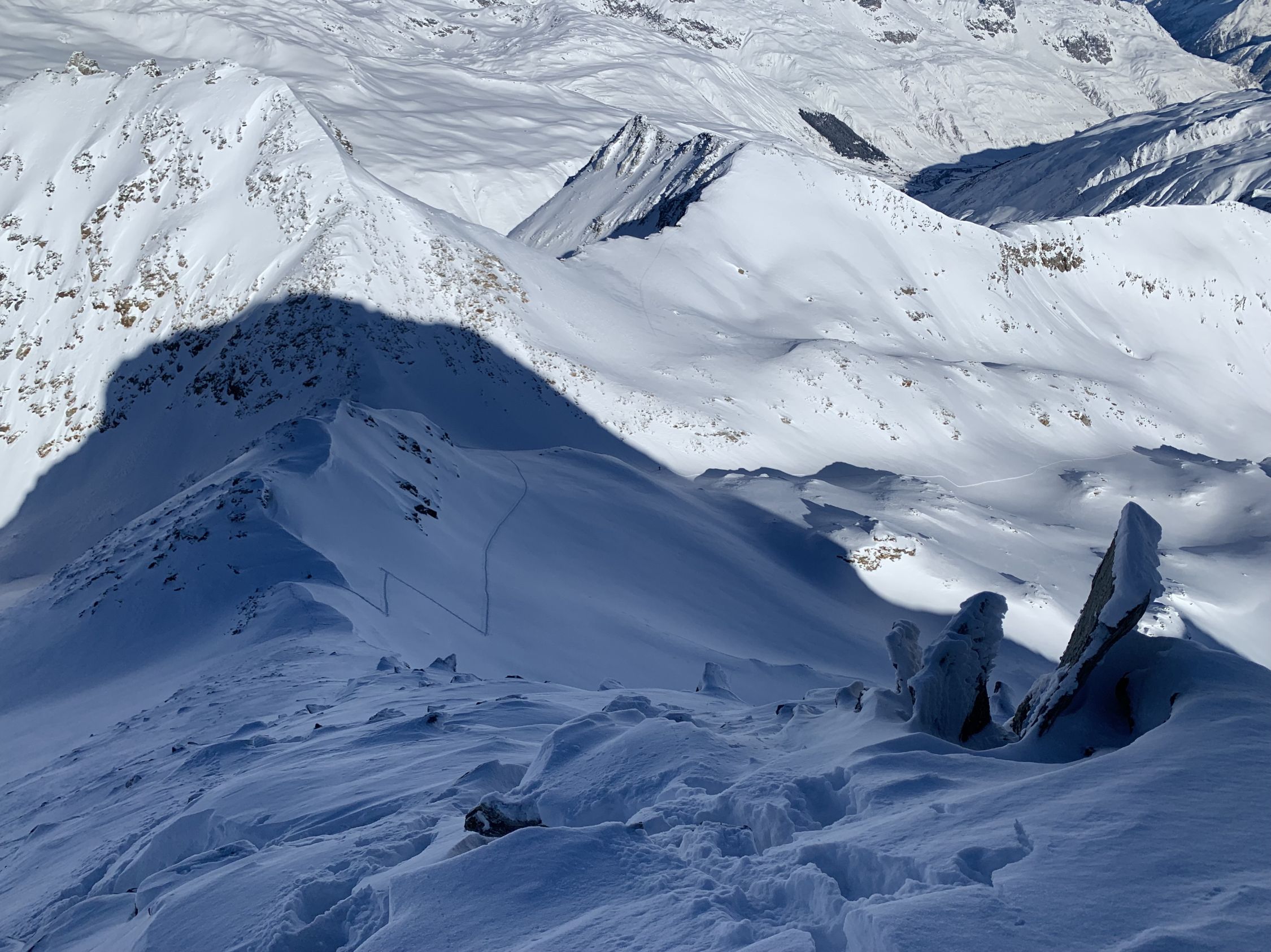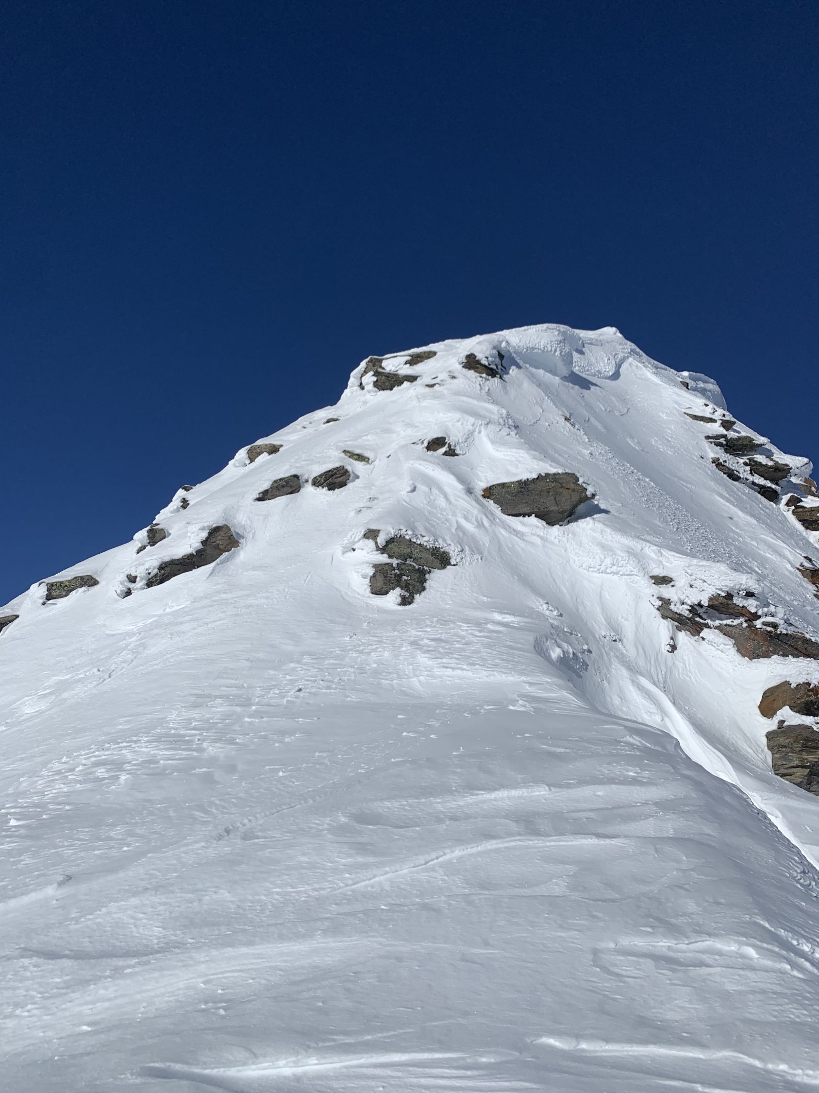 Gipfelaufstieg Leckihorn Lockerschnee, ginge vermutlich auch ohne Steigeisen/Pickel. Südgrat Gross Muttenhorn deutlich anspruchsvoller (es ist zumindest nicht der "einfache" Geröllrücken, wie mancherorts vermerkt). Durch Lockerschnee z.T. knietief gespurt. Achtung: Der Grat ist teilweise stark verwächtet, Vorsicht! Abstieg Südgrat problemlos, trotz reichlich Lockerschnee. Die Crux der Route ist sicherlich der Durchschlupf durch die Wächten hinab zum Muttgletscher. Das Coulour hat 45 Grad auf 60 Hm, oben hängen die Wächten bedrohlich über. Zwischen den Wächten finden sich genau an der richtigen Stelle der Durchschlupf. Hätte ich irgendwelche Lawinenzeichen vorher auf der Route bemerkt, wäre ich definitiv nicht durch das Couloir abgefahren (ausgegeben: 2+). Dann besser auf Oberwald via Saas. Die Überschreitung über den Stotzigen musste ich dann bei P2745 abbrechen. Ich brauchte zu lange und es war mittlerweile 16:15 Uhr… Verhältnisse hätten es aber zugelassen, mit ein bisschen Trickserei können die Ski praktisch immer an den Füssen bleiben.