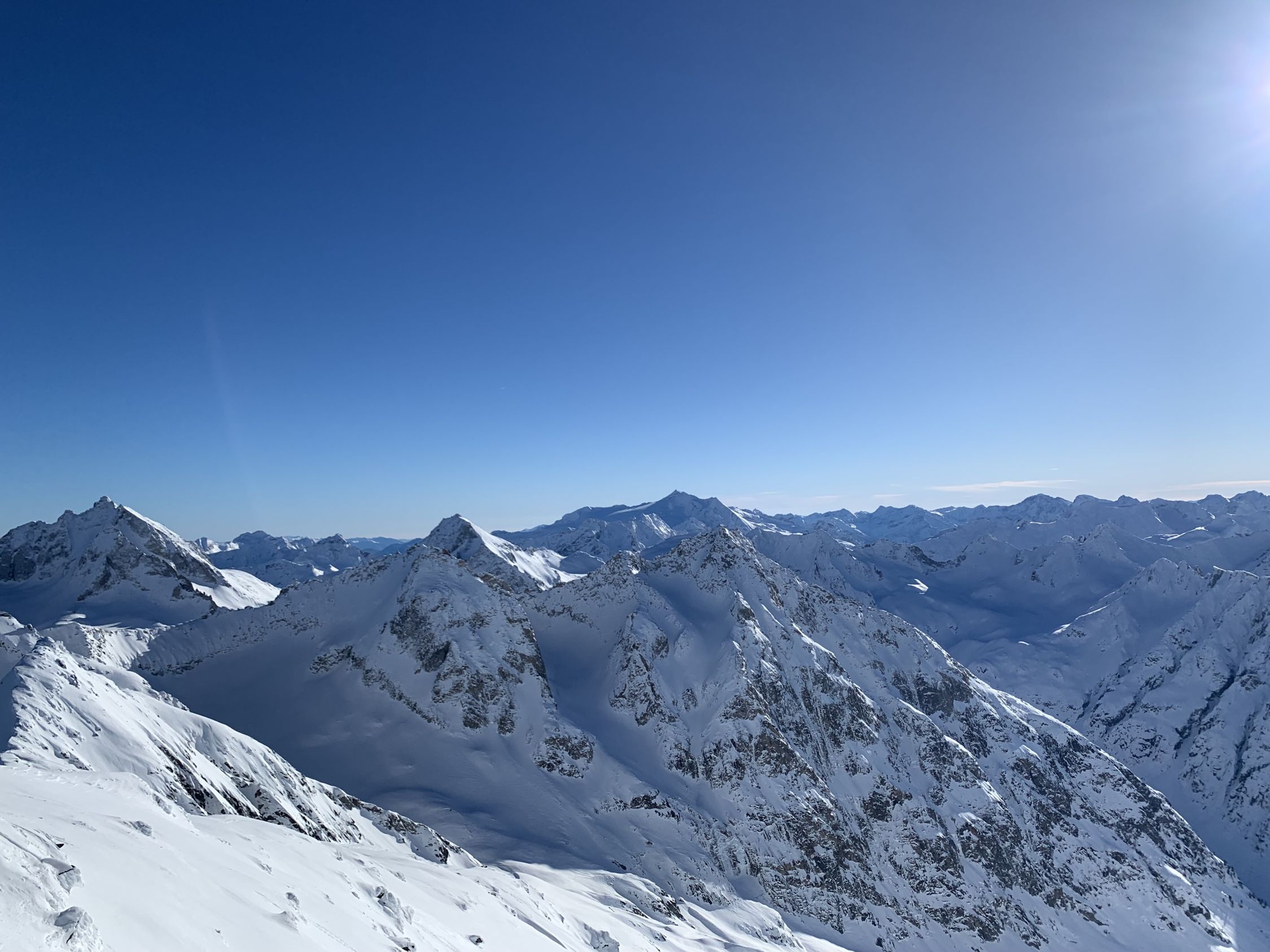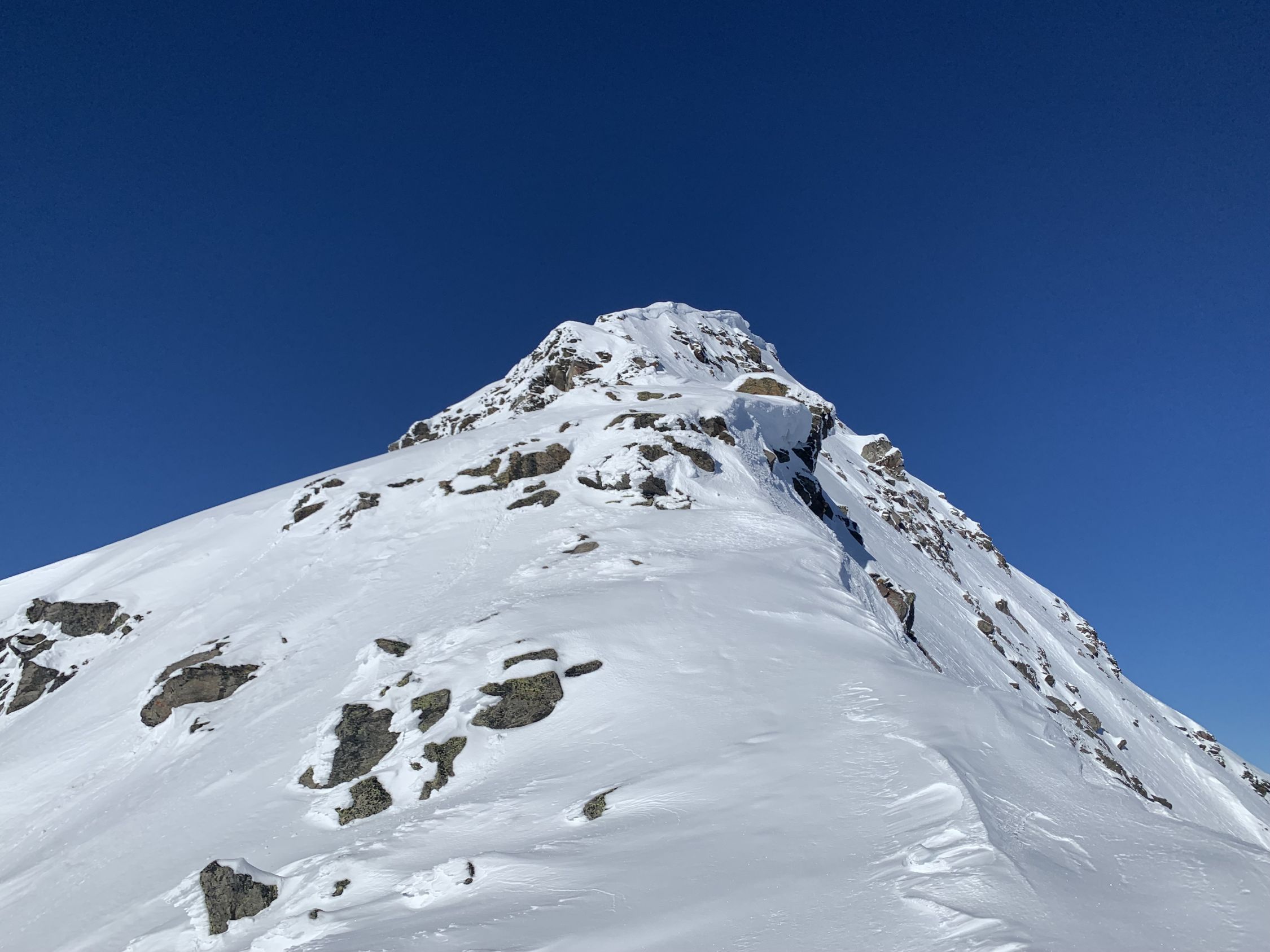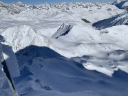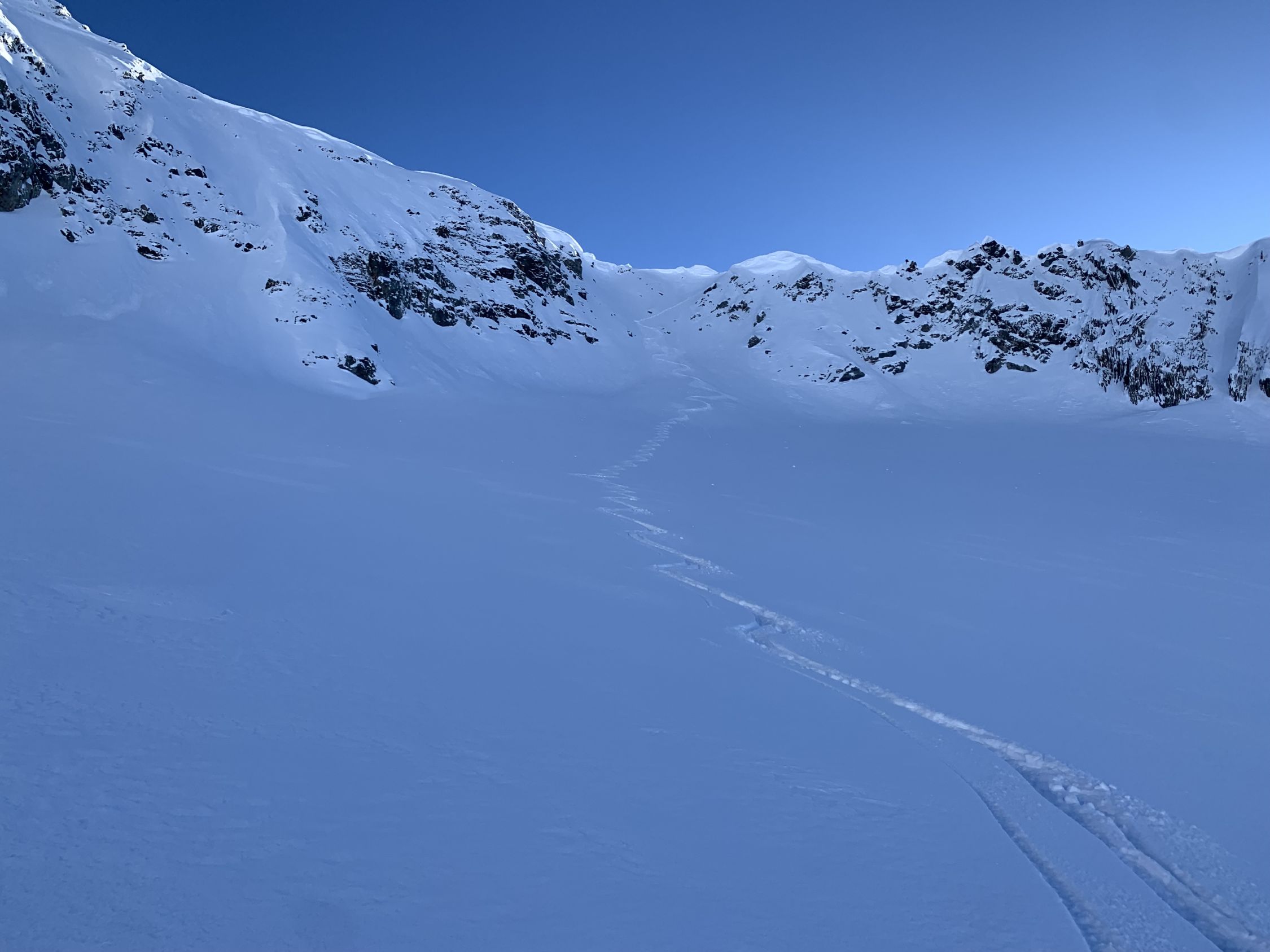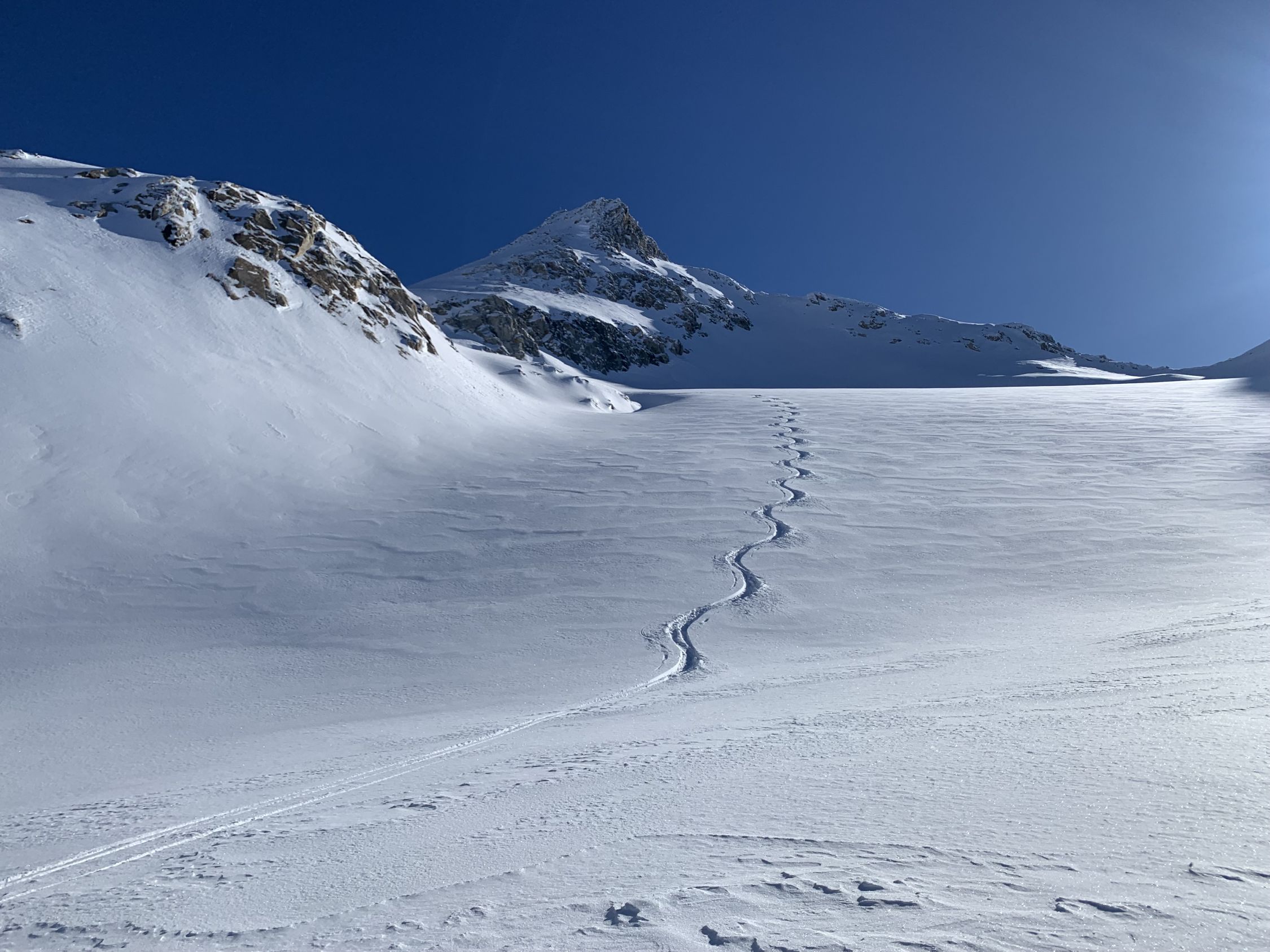 Gipfelaufstieg Leckihorn Lockerschnee, ginge vermutlich auch ohne Steigeisen/Pickel. Südgrat Gross Muttenhorn deutlich anspruchsvoller (es ist zumindest nicht der "einfache" Geröllrücken, wie mancherorts vermerkt). Durch Lockerschnee z.T. knietief gespurt. Achtung: Der Grat ist teilweise stark verwächtet, Vorsicht! Abstieg Südgrat problemlos, trotz reichlich Lockerschnee. Die Crux der Route ist sicherlich der Durchschlupf durch die Wächten hinab zum Muttgletscher. Das Coulour hat 45 Grad auf 60 Hm, oben hängen die Wächten bedrohlich über. Zwischen den Wächten finden sich genau an der richtigen Stelle der Durchschlupf. Hätte ich irgendwelche Lawinenzeichen vorher auf der Route bemerkt, wäre ich definitiv nicht durch das Couloir abgefahren (ausgegeben: 2+). Dann besser auf Oberwald via Saas. Die Überschreitung über den Stotzigen musste ich dann bei P2745 abbrechen. Ich brauchte zu lange und es war mittlerweile 16:15 Uhr… Verhältnisse hätten es aber zugelassen, mit ein bisschen Trickserei können die Ski praktisch immer an den Füssen bleiben.