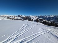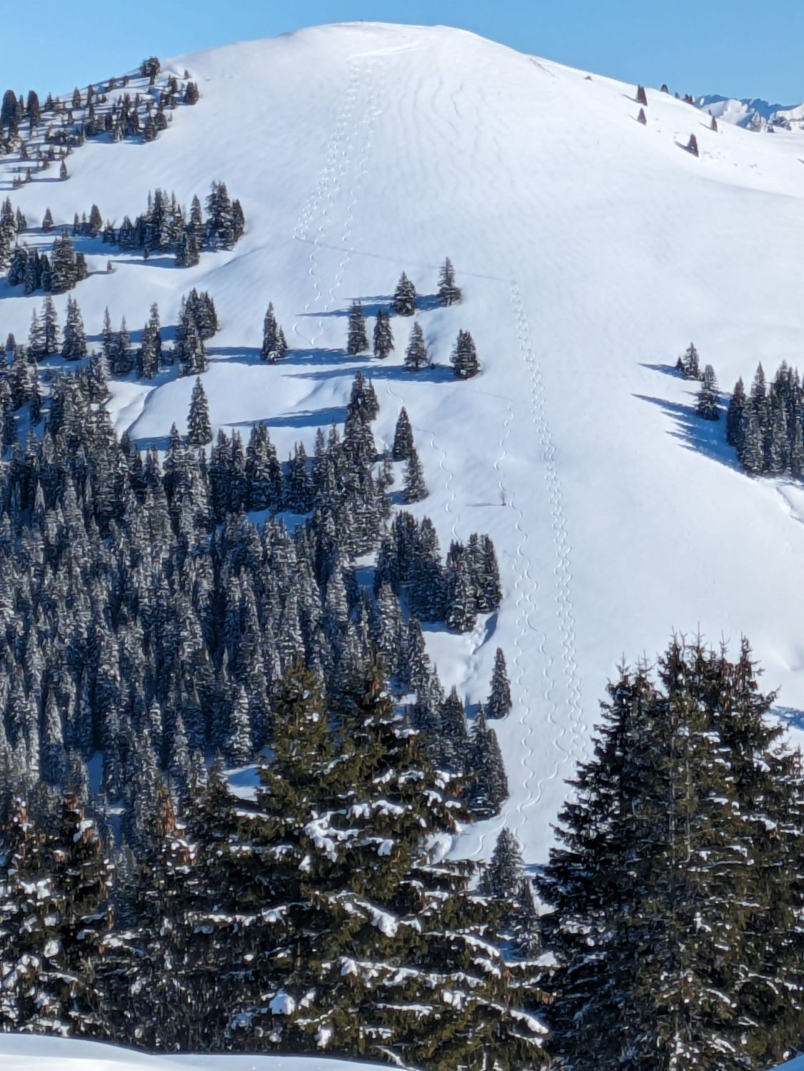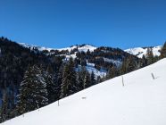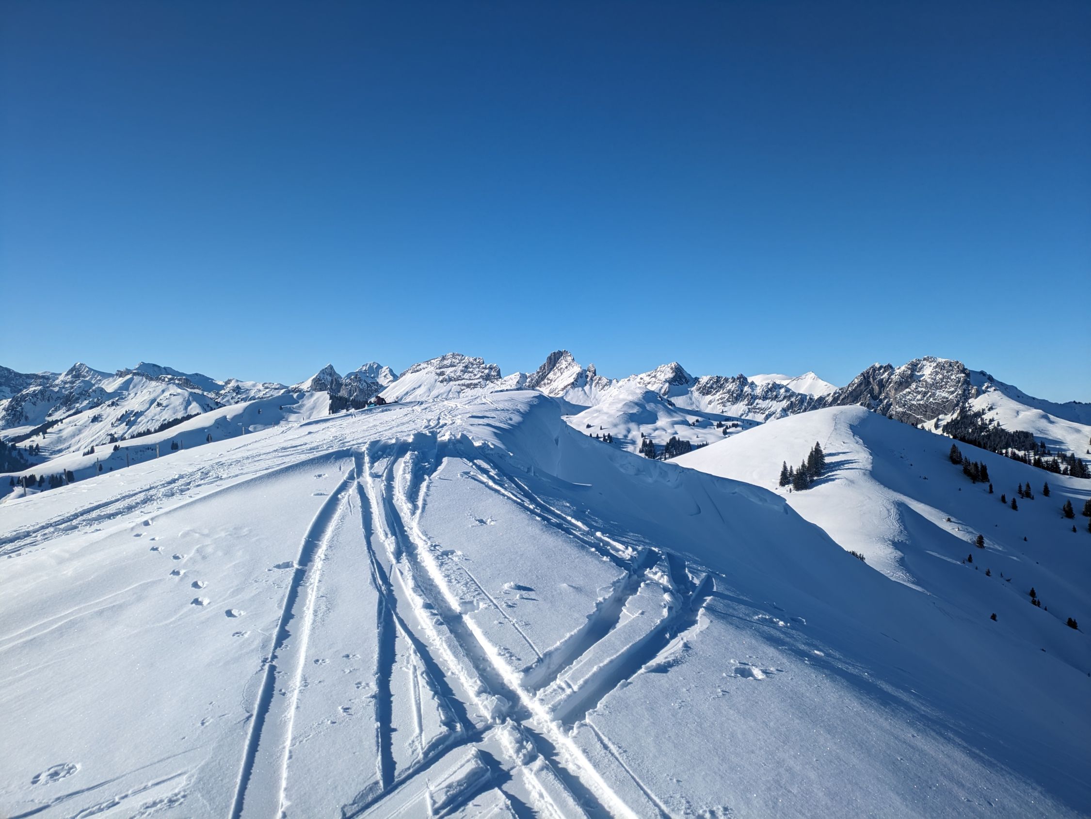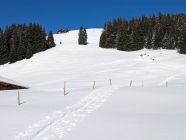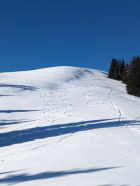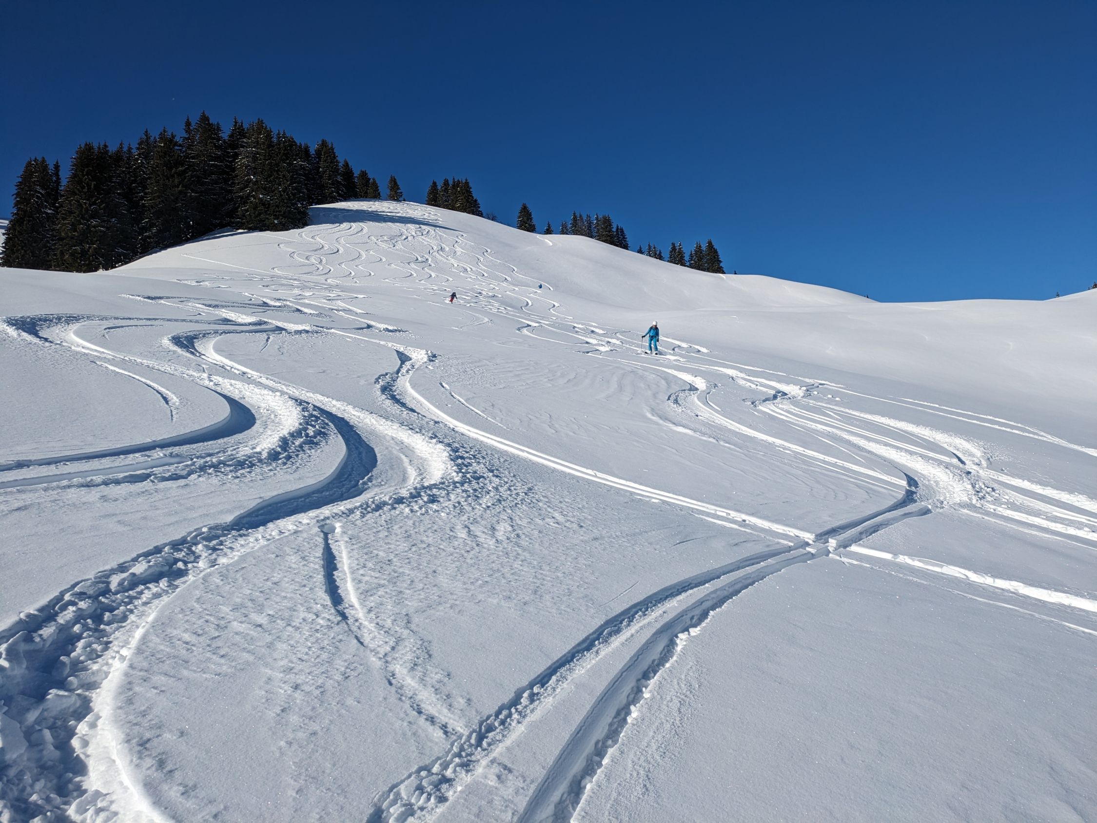 Wir fellten bei der Brücke (Pkt. 1'442 m) beim Bireweg nochmals auf, um noch das Wannehörnli zu besteigen. Im Aufstieg zum Wannehörnli erlebten wir frühlingshafte (!) Temperaturen. Die Abfahrt vom Wannehörnli hinunter nach Saanemöser war trotz langsam schwerer werdendem Pulver ein Genuss. Im untersten Teil (unterhalb ca. 1'400m) liegt unter dem neu gefallenen Schnee keine Unterlage mehr - vereinzelt sind Grasbüschel sichtbar, die im Moment aber noch einfach zu umfahren sind. Abfahrt bis Saanemöserstrasse (1'260m) noch möglich.