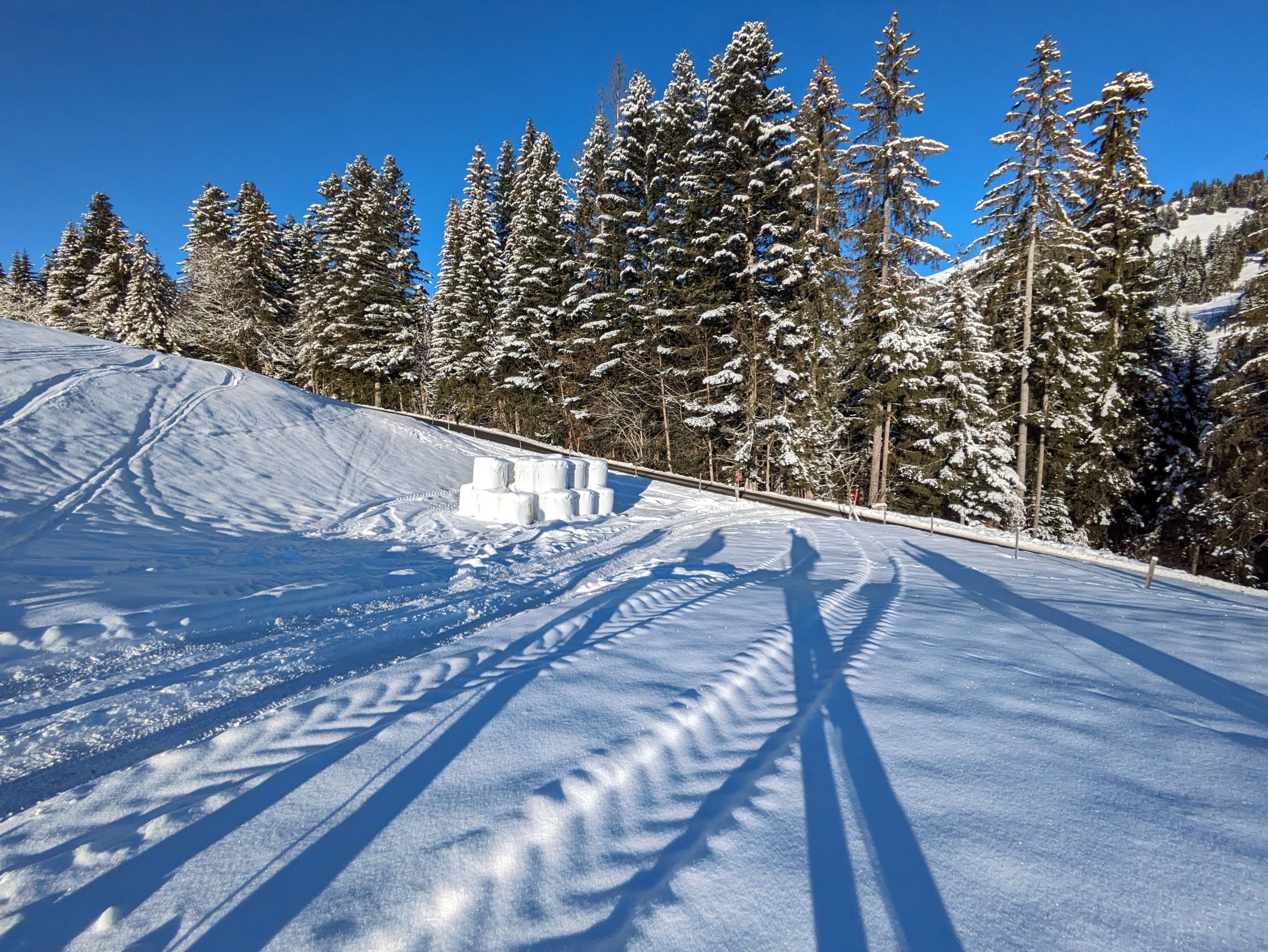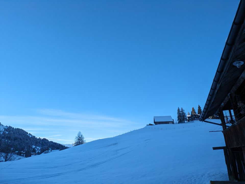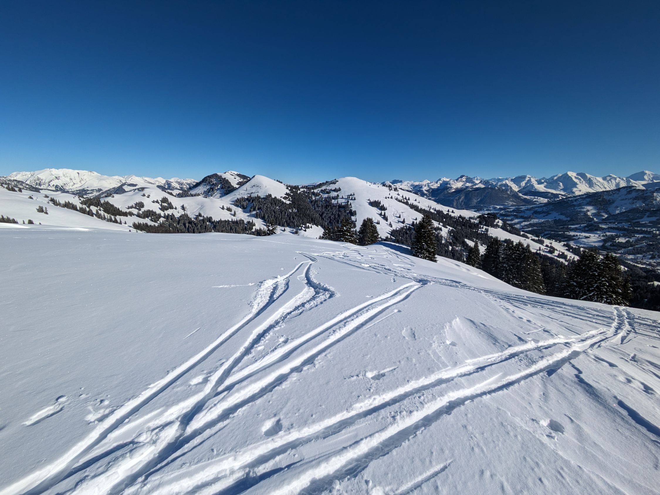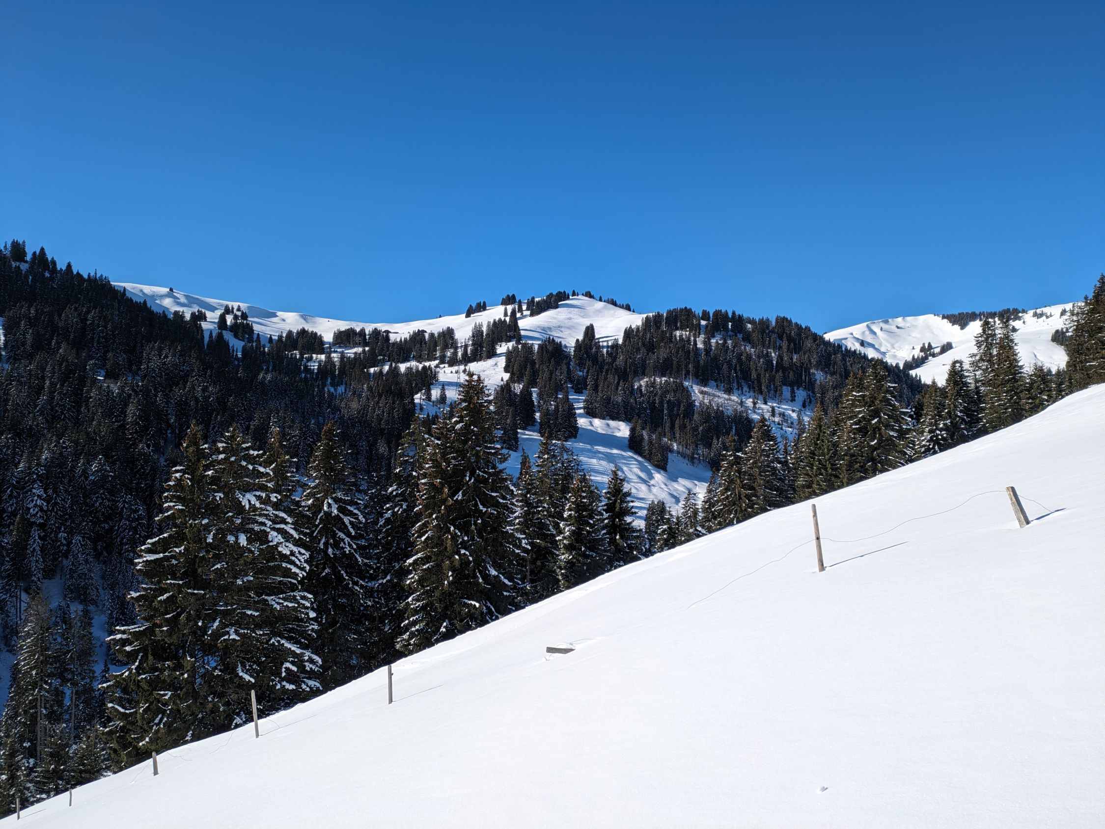 Wir fellten bei der Brücke (Pkt. 1'442 m) beim Bireweg nochmals auf, um noch das Wannehörnli zu besteigen. Im Aufstieg zum Wannehörnli erlebten wir frühlingshafte (!) Temperaturen. Die Abfahrt vom Wannehörnli hinunter nach Saanemöser war trotz langsam schwerer werdendem Pulver ein Genuss. Im untersten Teil (unterhalb ca. 1'400m) liegt unter dem neu gefallenen Schnee keine Unterlage mehr - vereinzelt sind Grasbüschel sichtbar, die im Moment aber noch einfach zu umfahren sind. Abfahrt bis Saanemöserstrasse (1'260m) noch möglich.