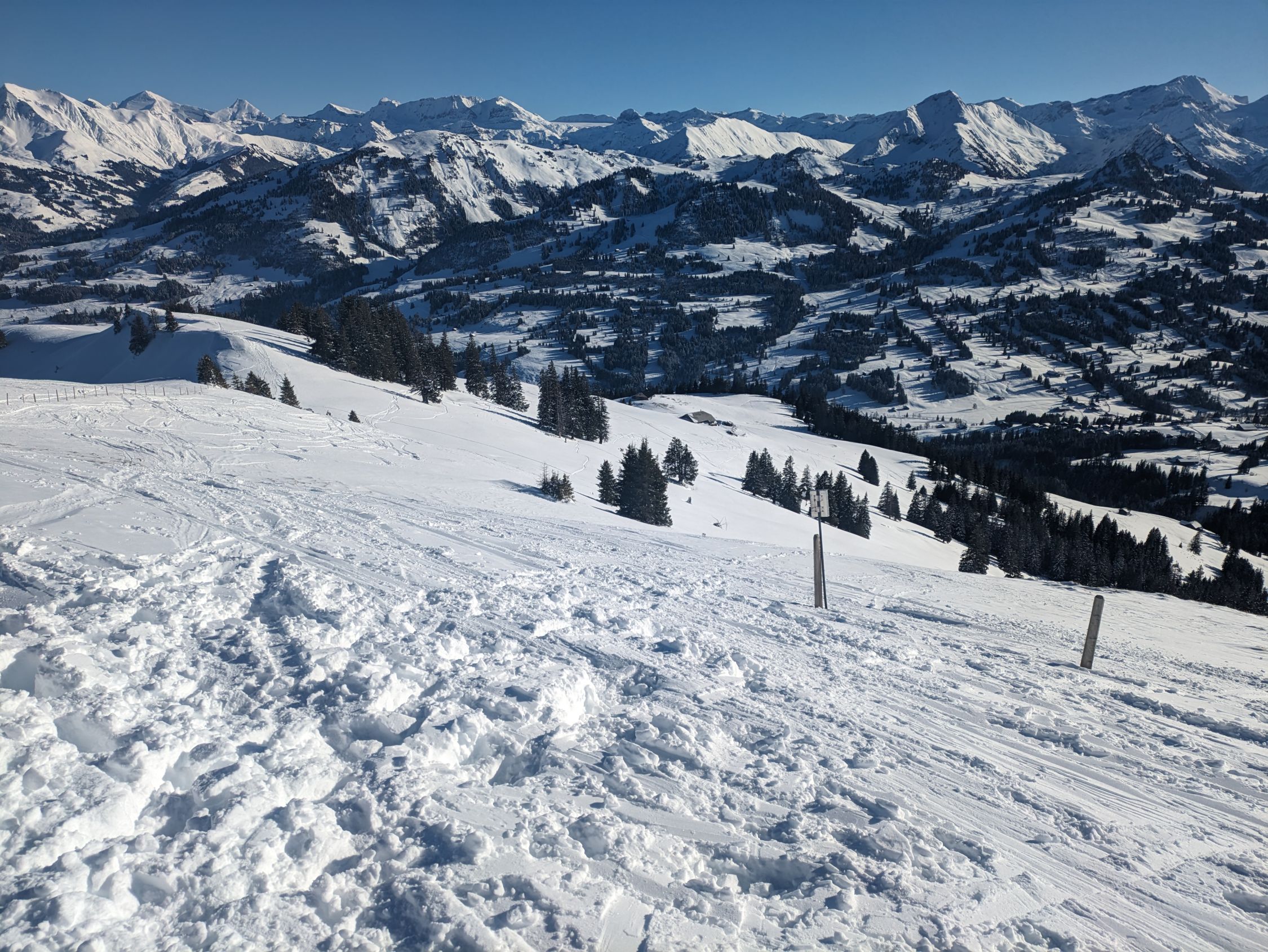 Start mit aufgefellten Skis aktuell ab Saanenmöser möglich, heute bereits zu Beginn (09:20 h) recht warm im Aufstieg. Ab zirka 1'500 m aufwärts sehr gut eingeschneit. In der Abfahrt toller Pulver bis vorderi Bergsimme.