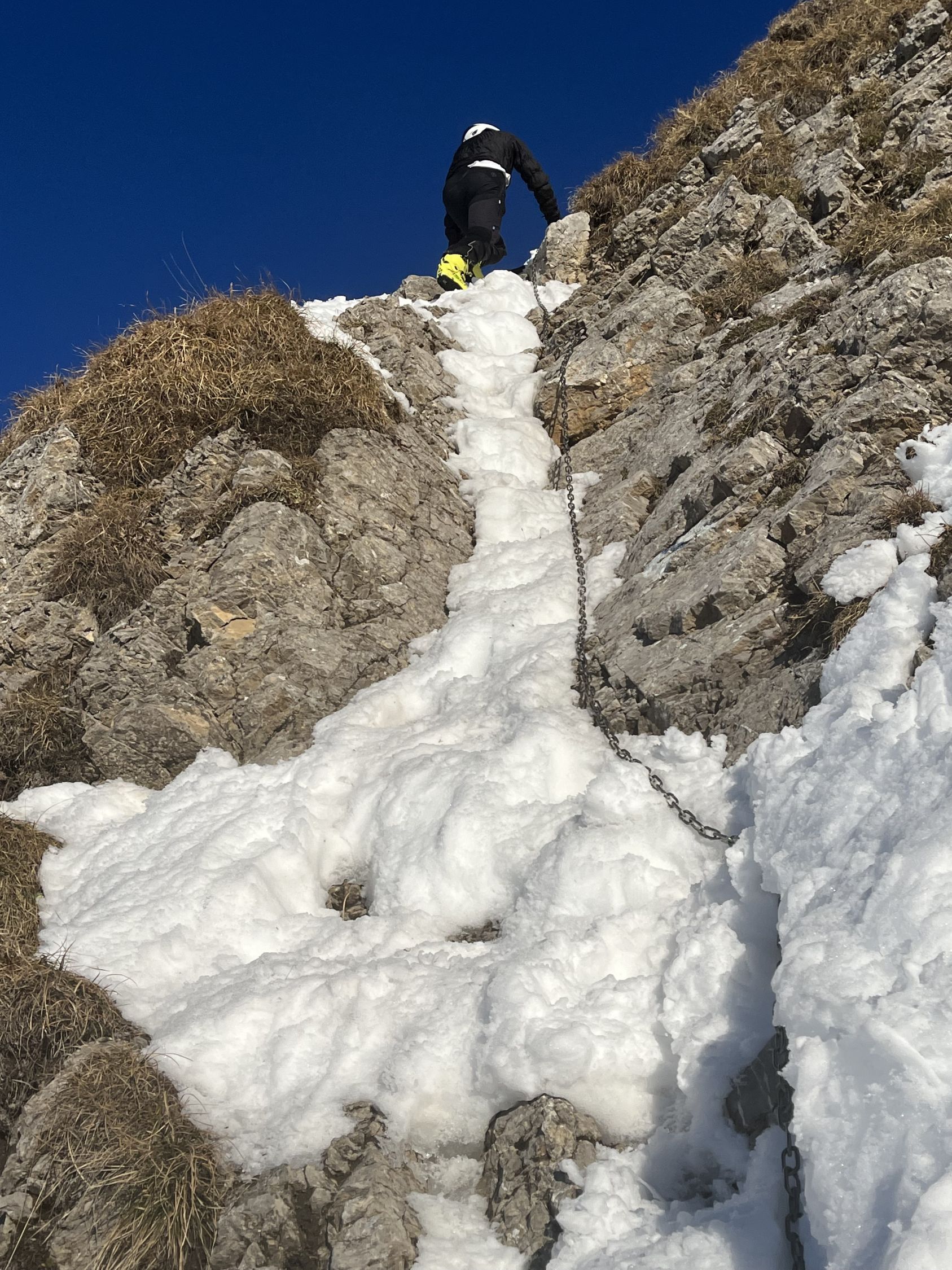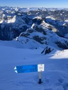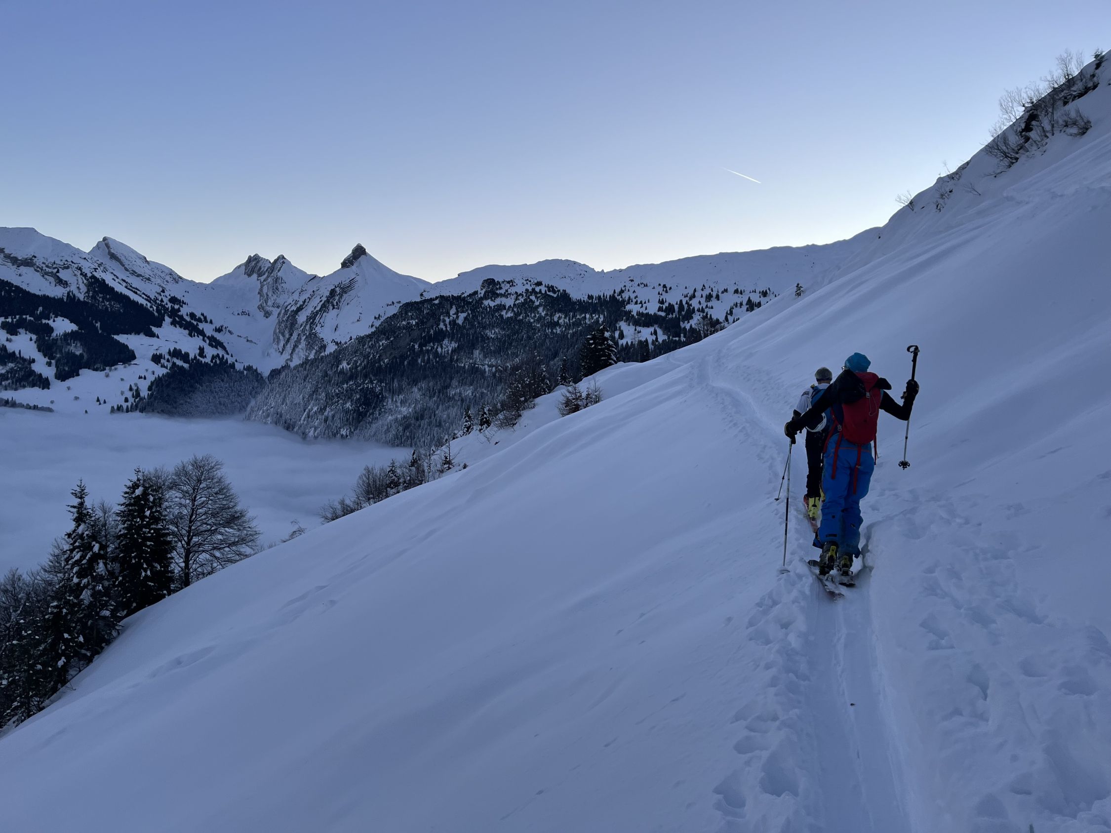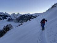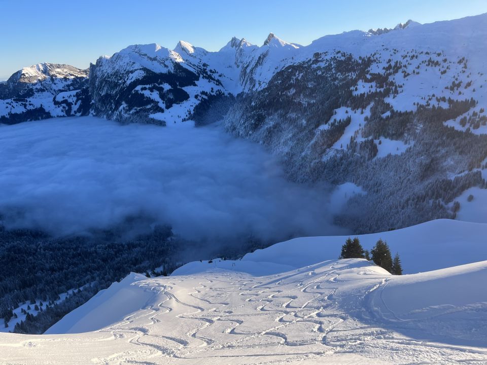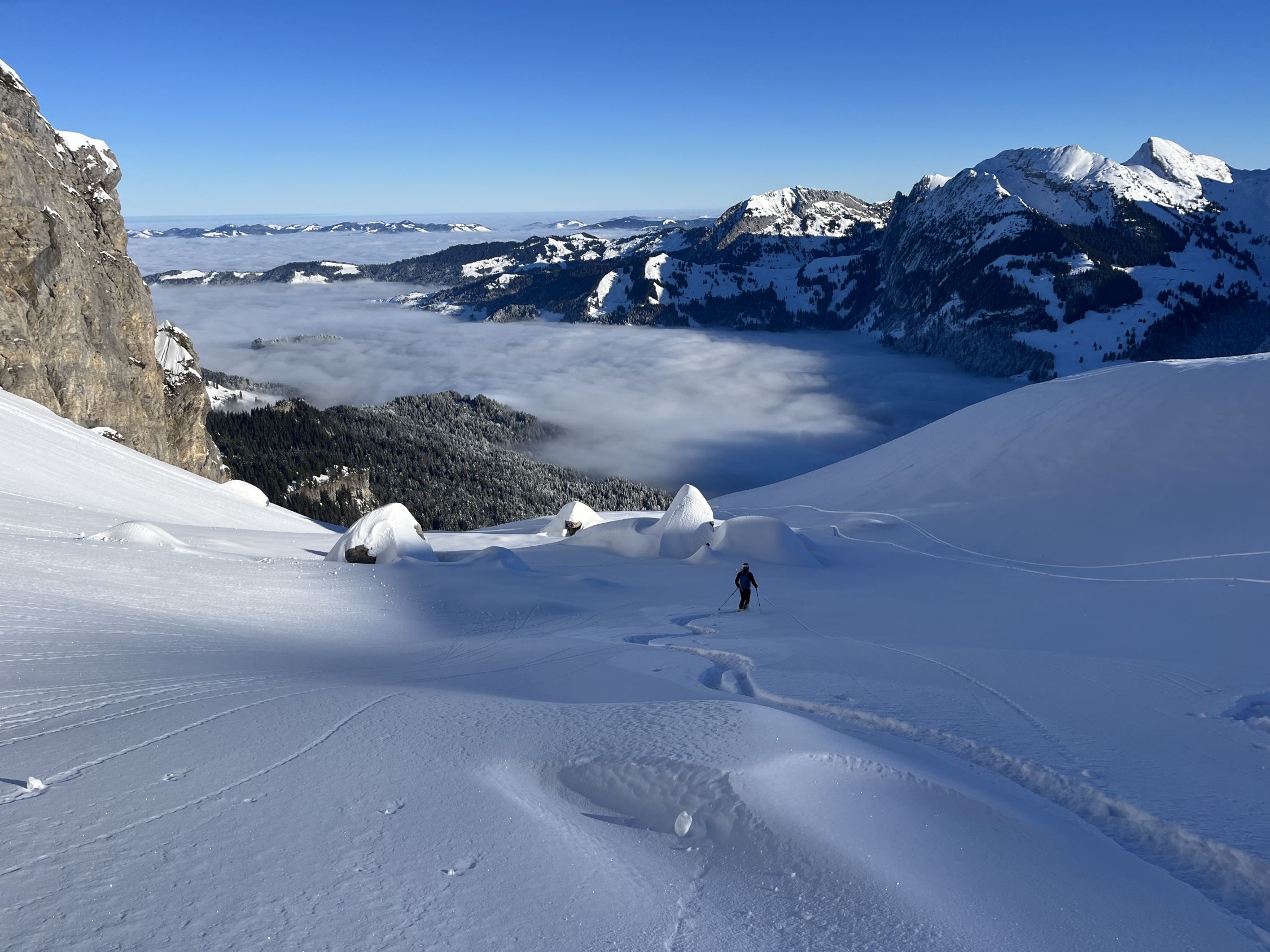 Top Verhältnisse am Fluebrig. Unten noch knapp Schnee, oberhalb 1200 gut, ca 30 cm Pulver. Durchgehend gute Spur, für den Gipfel Pickel oder Steigeisen ratsam. Die Kette ist nur teilweise freigelegt. Abfahrt durchgehend gut.