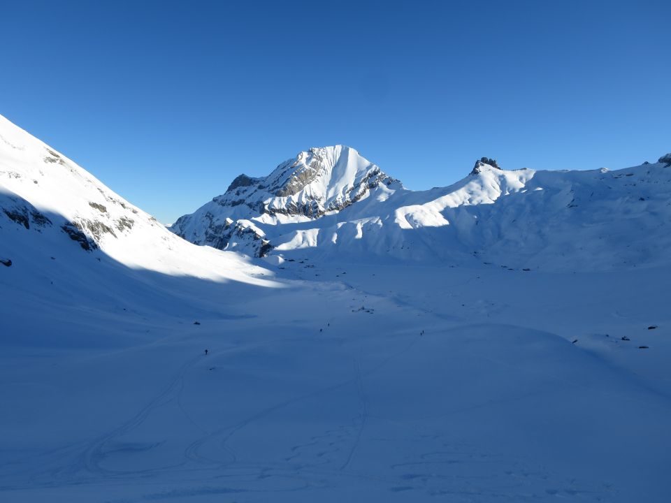 Perfekter Schnee von oben bis unten. Auch sehr gute Spuren vorhanden. Wir haben die Variante über die Ostflanke und den Nordostgrat genommen und haben ein Skidepot kurz vor dem Gipfel gemacht. Es ist aber gut möglich, mit den Skis bis ganz oben zu gehen. Die Spur über den Ammertepass sieht von oben auch gut aus.