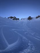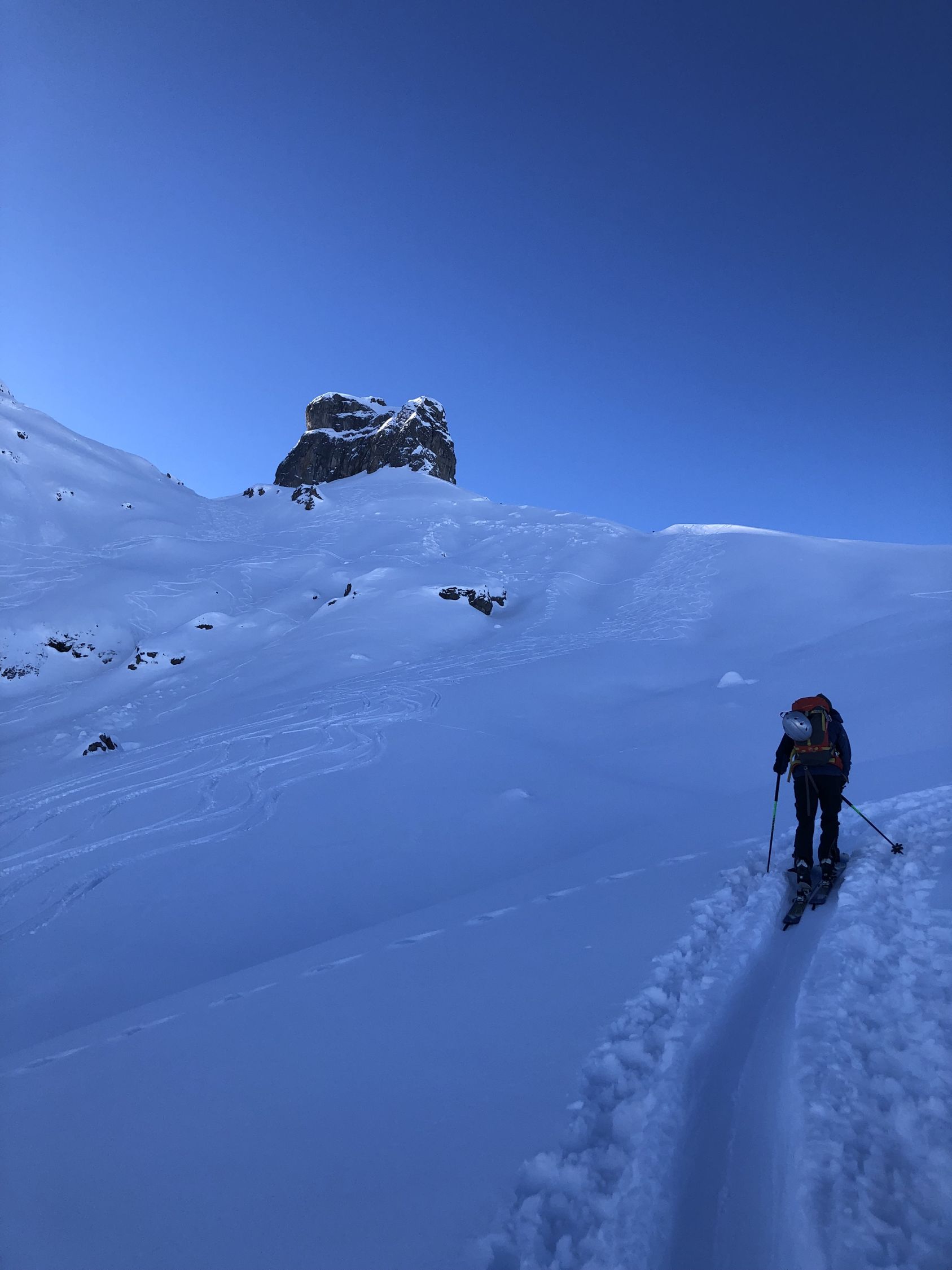 Die Fahrstrasse auf die Griesalp ist gut eingeschneit. Wir haben die Abfahrt vom Westgipfel des Bundstocks via Nordflanke nach Obere Dünde gewählt, dort hat es noch wenig Spuren und Pulverschnee ohne Ende. Von Obere Dünde sind wir auf den Dündegrat bis unterhalb von Pt. 2308 wieder aufgestiegen (ca. 300 HM), um via Schafberg, Chatzenegg, Chüegwindli und Mittelberg wieder nach Tschingel abzufahren. Diese Abfahrtsvariante ist aktuell perfekt zu fahren und landschaftlich sehr reizvoll. Nicht verpassen: Gerstensuppe im Rest. Alpenruh!