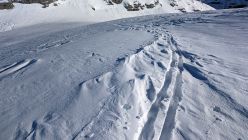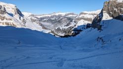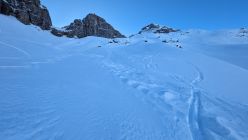 Für die Abfahrt habe ich den Weg durch das grosse Couloir und den Nordhang gewählt. Dort hatte es noch mehr als genug Platz für eigene Spuren. Es hat ca. 40 bis 50cm gut gesetzten Pulver, stellenweise allerdings mit einer eingelagerten, festeren Schicht. Ein bisschen aktives Fahren ist also nötig ;). Auch der Aufstiegsroute folgend gab es von den Vortagen nur wenige Abfahrtsspuren.