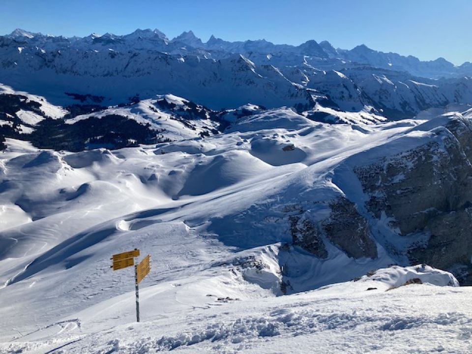 Prachtstag an der Schatten. Sonne, genug Schnee und von oben bis unten Pulver. Einzig auf dem Gipfel wehte eine steife Bise, so dass der Mittagslunch nach halber Abfahrt angesagt war.