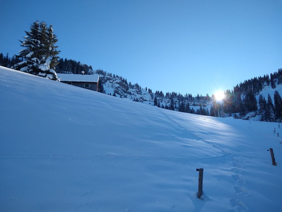 lockerer Pulver, im unteren steileren Hang allerdings gerade ausreichend. Man kommt ganz gut ohne Feindkontakt durch, unten kommt man gut auf dem gewalzten Weg zur Hochgratbahn