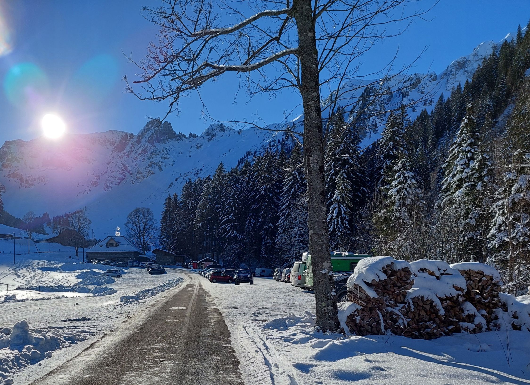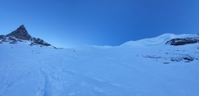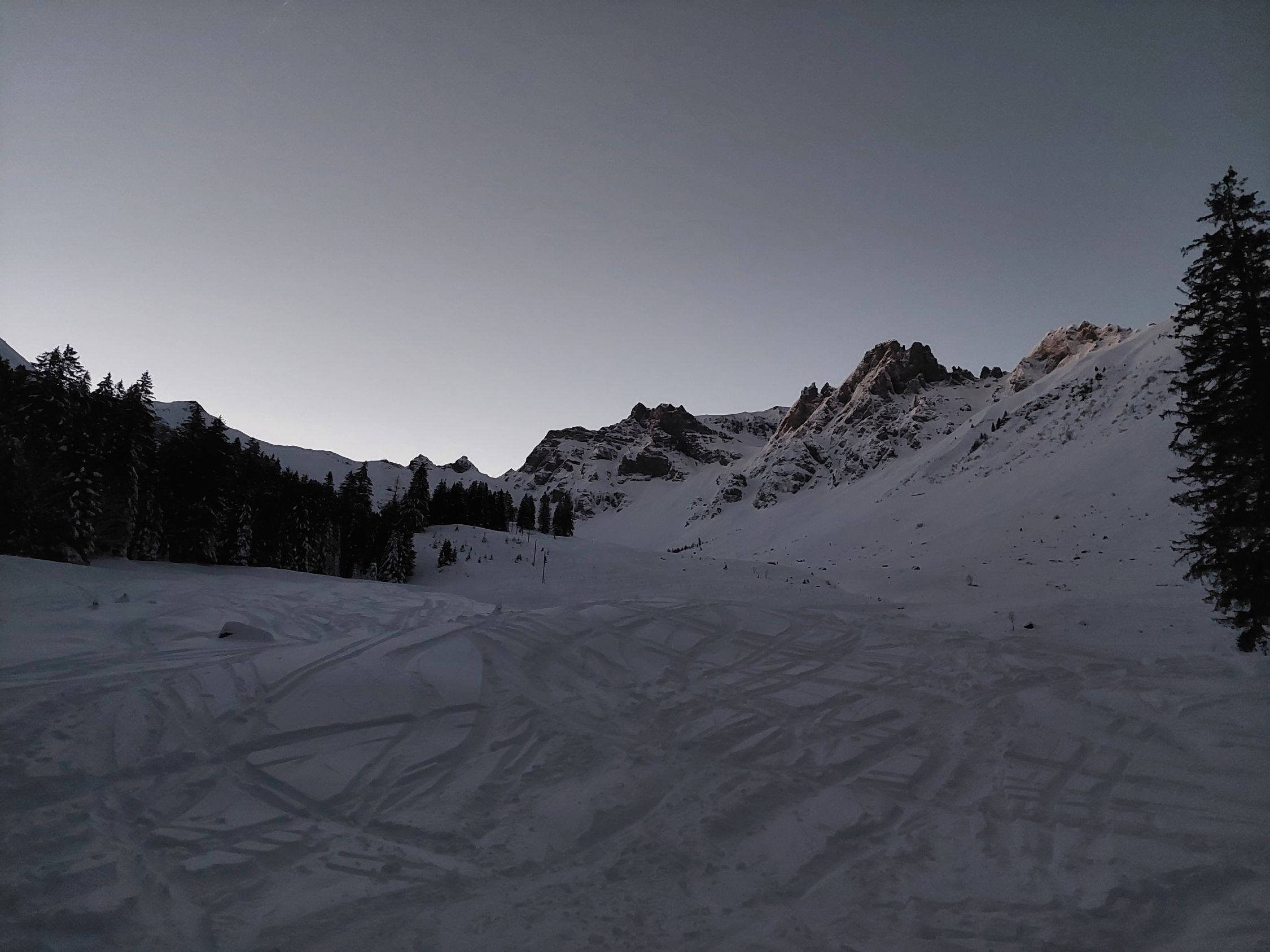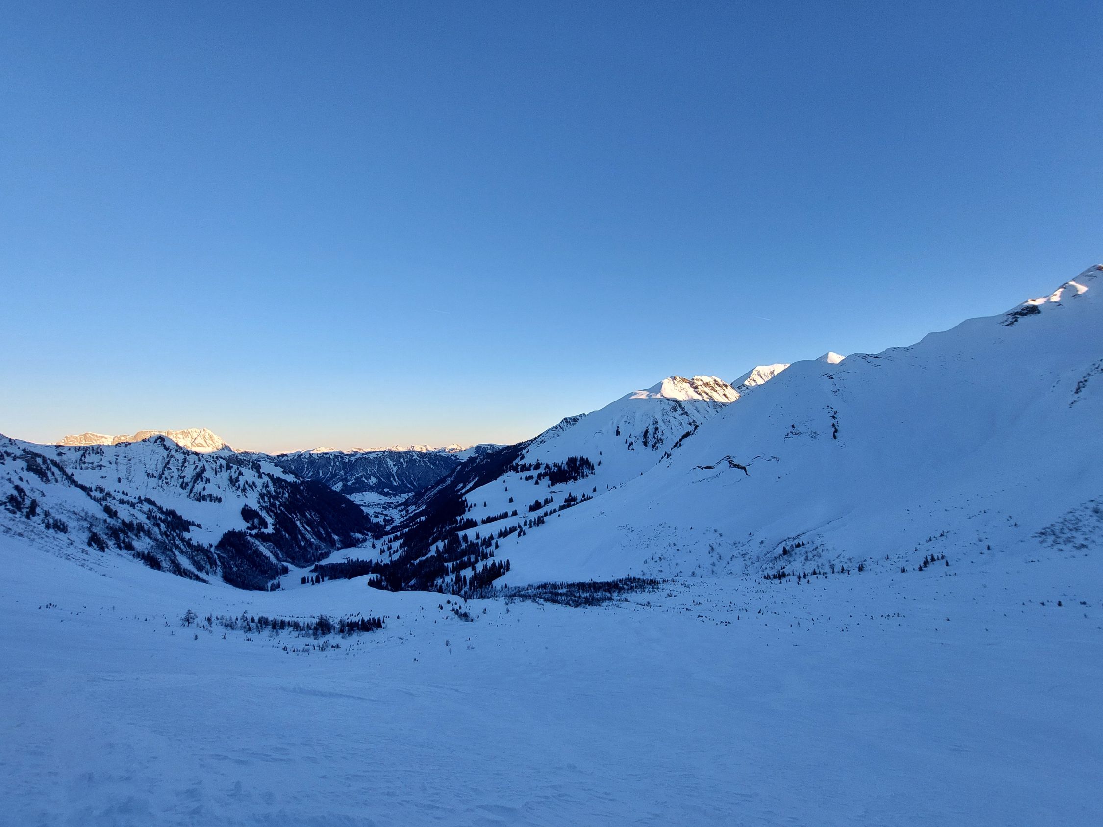 Abfahrt: Vom Landvogtehore bis zur Lücke hat es, von oben gesehen rechts, schönen Pulver. Die ersten 50 Hm ab der Lücke sind ziemlich verfahren, dann bis zum Parkplatz schönster Pulverschnee.
